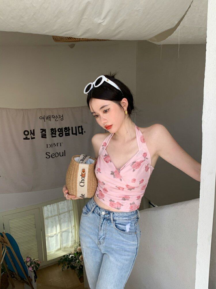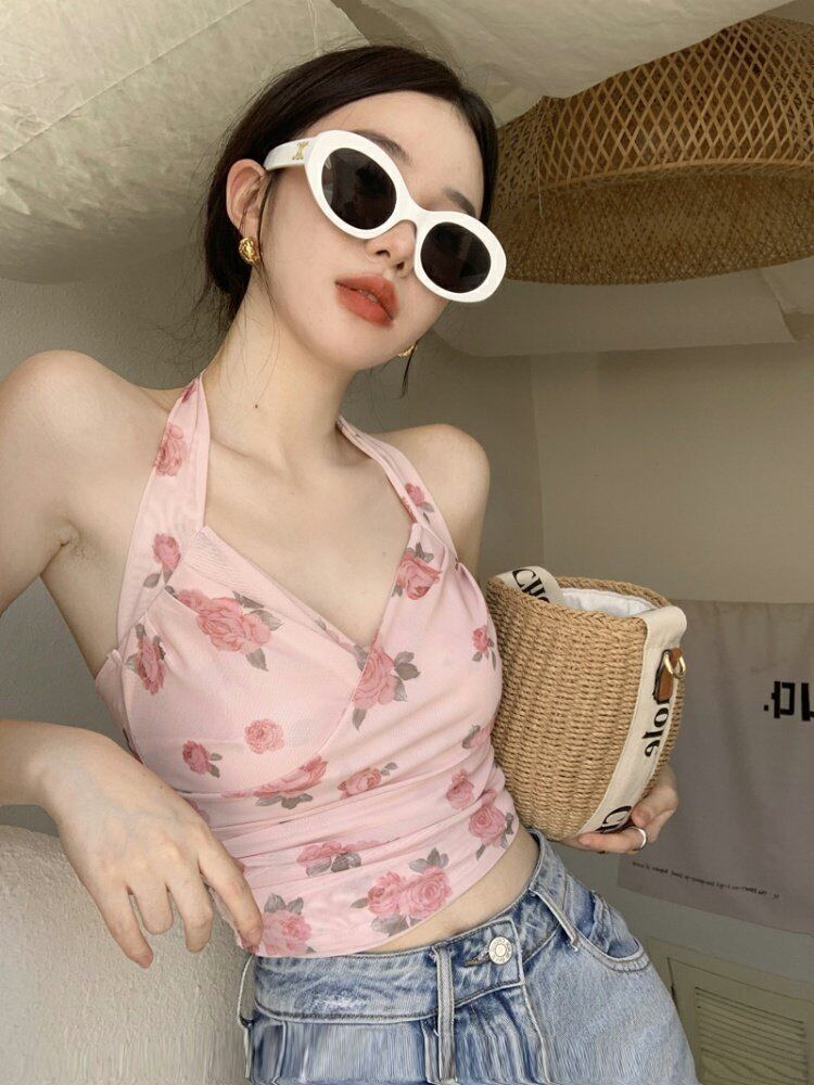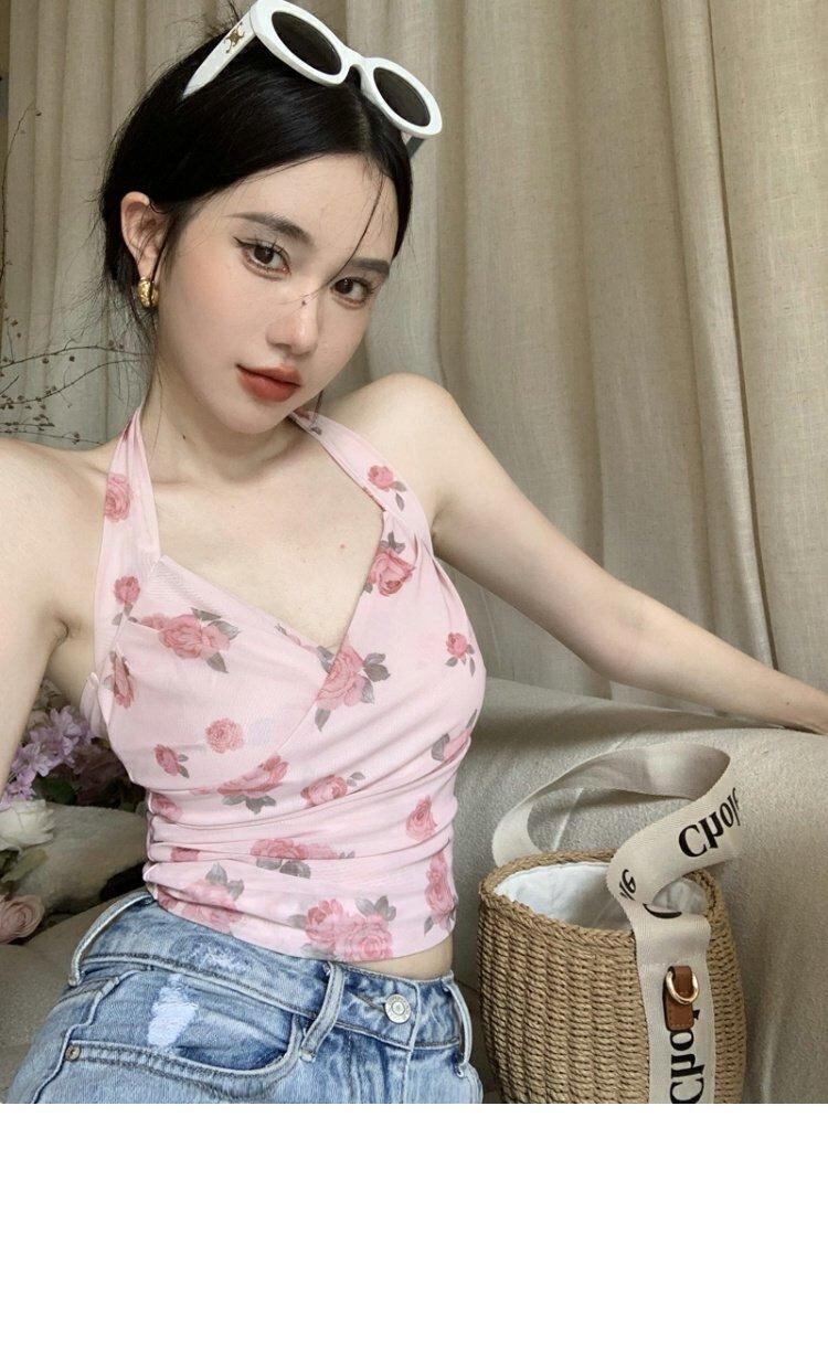 プリントメッシュホルターサマーバック薄手Flowerデザイン トップス ピンク 夏物 フラワーデザイン s576168304988477