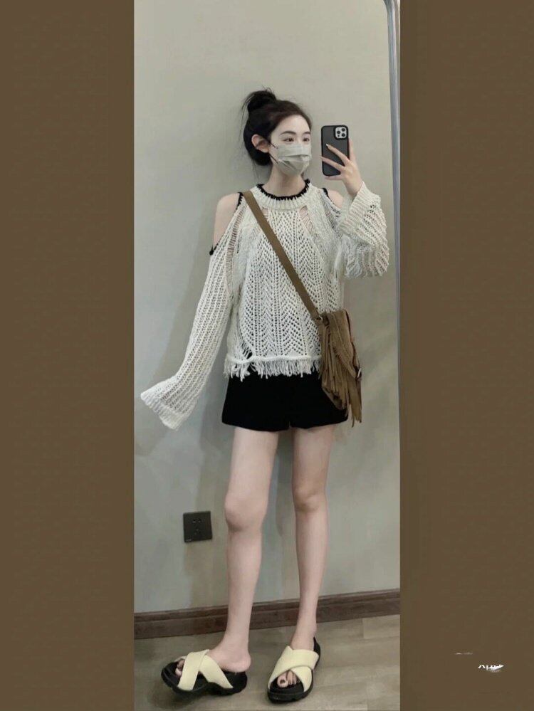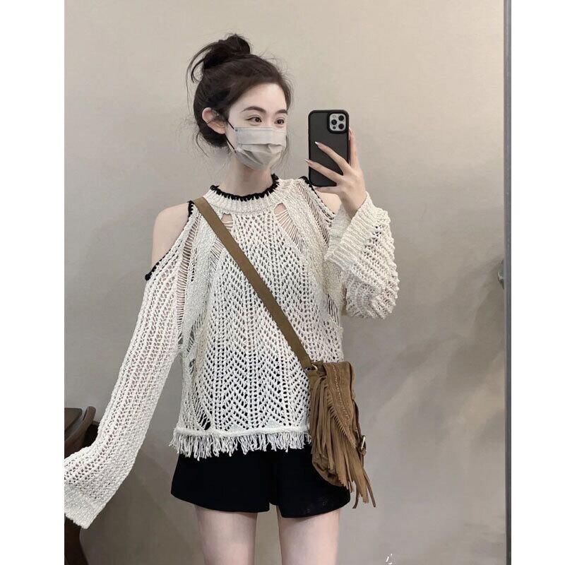 ホワイトニットセーター サマー薄手ブラウス トップス ロング 夏物 s576149394234496