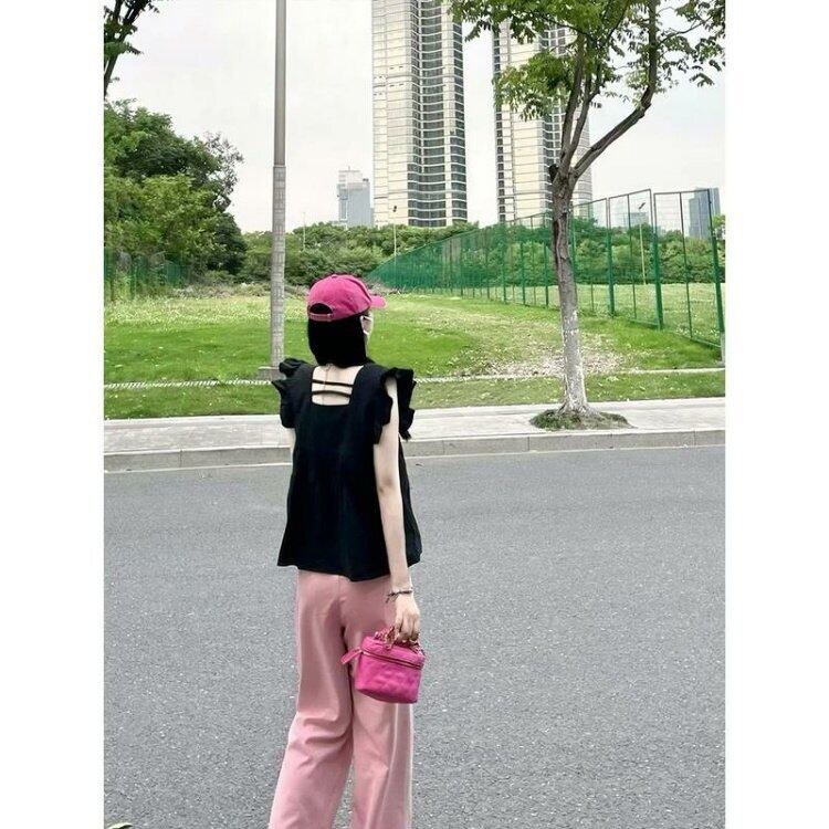 スリーブトップス サマースタンダードブラックノースリーブシャツ レトロ 夏物 s576194648896447