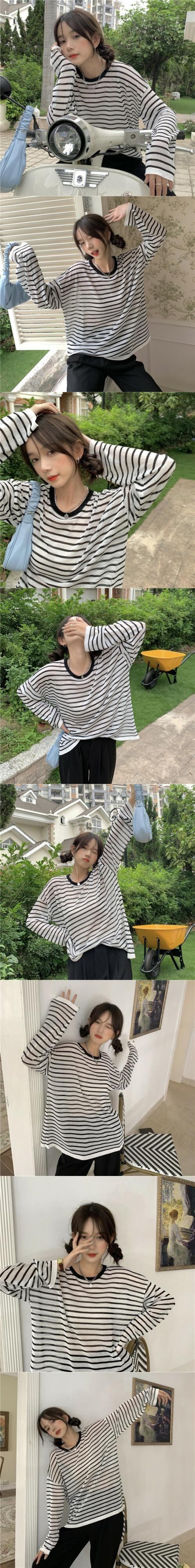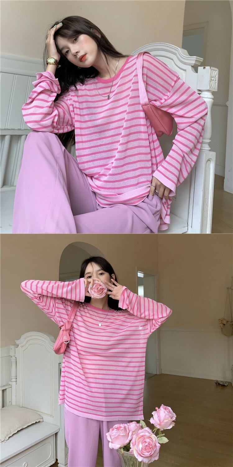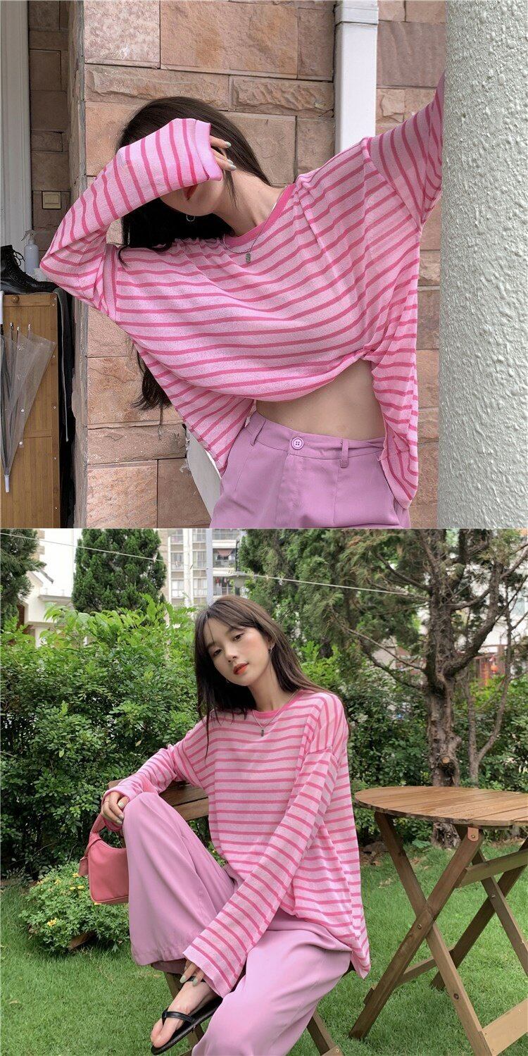 グリーンストライプTシャツ サマー薄手ブラウス レッドルーズスタイルトップス 夏物 s576126882407413