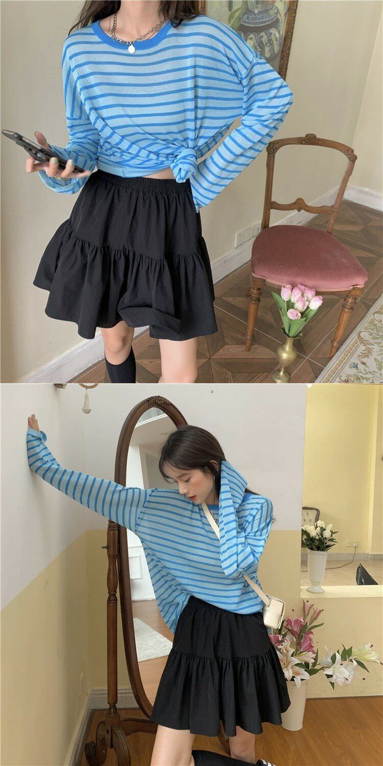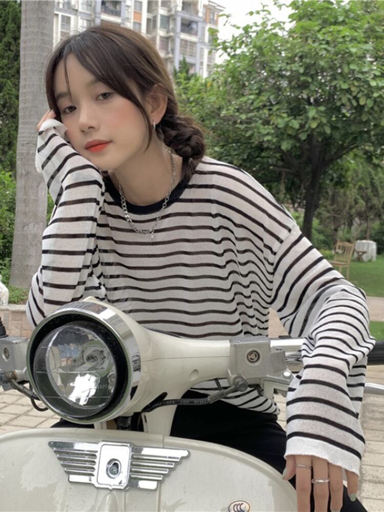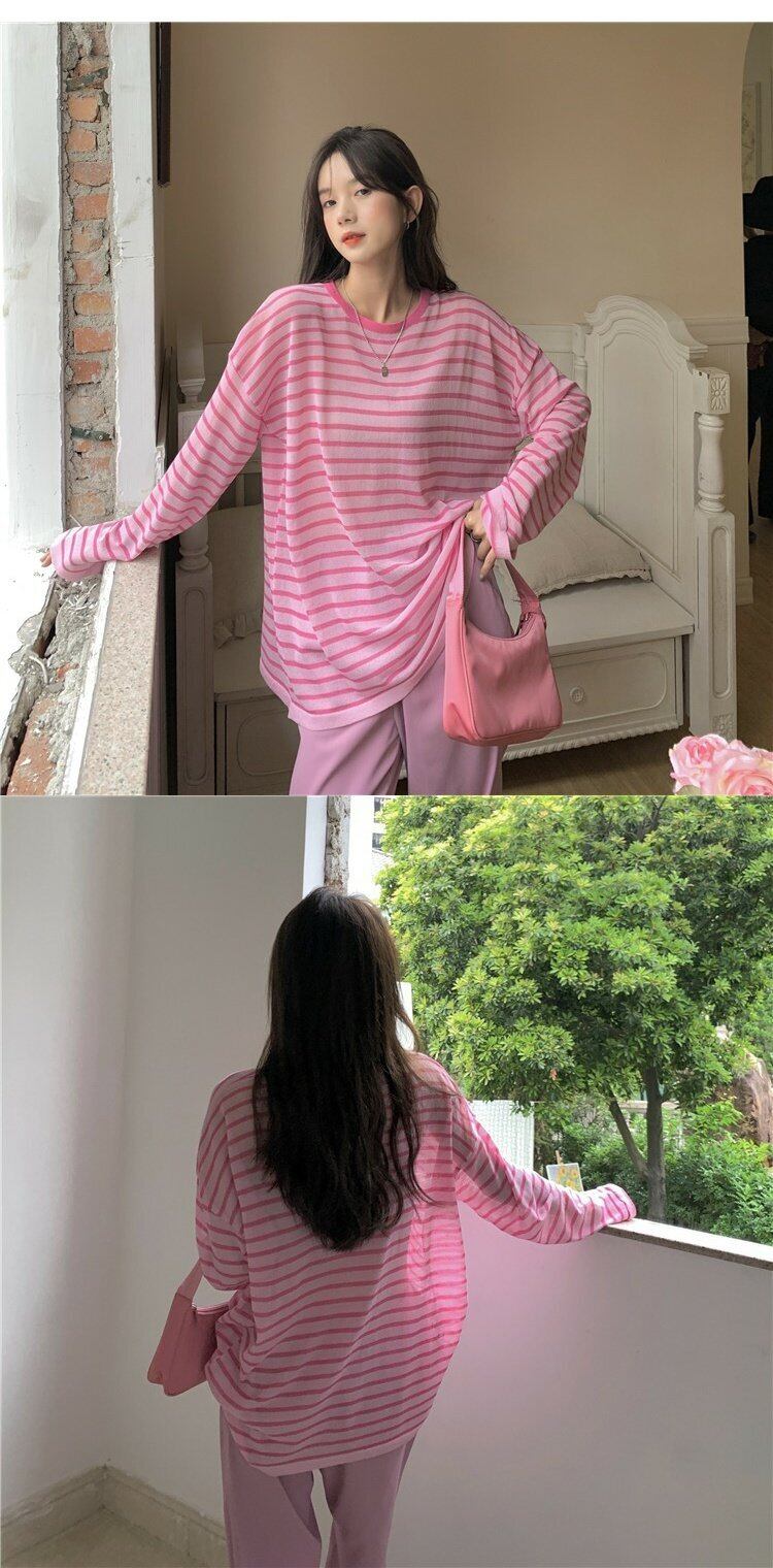 グリーンストライプTシャツ サマー薄手ブラウス レッドルーズスタイルトップス 夏物 s576126882407413