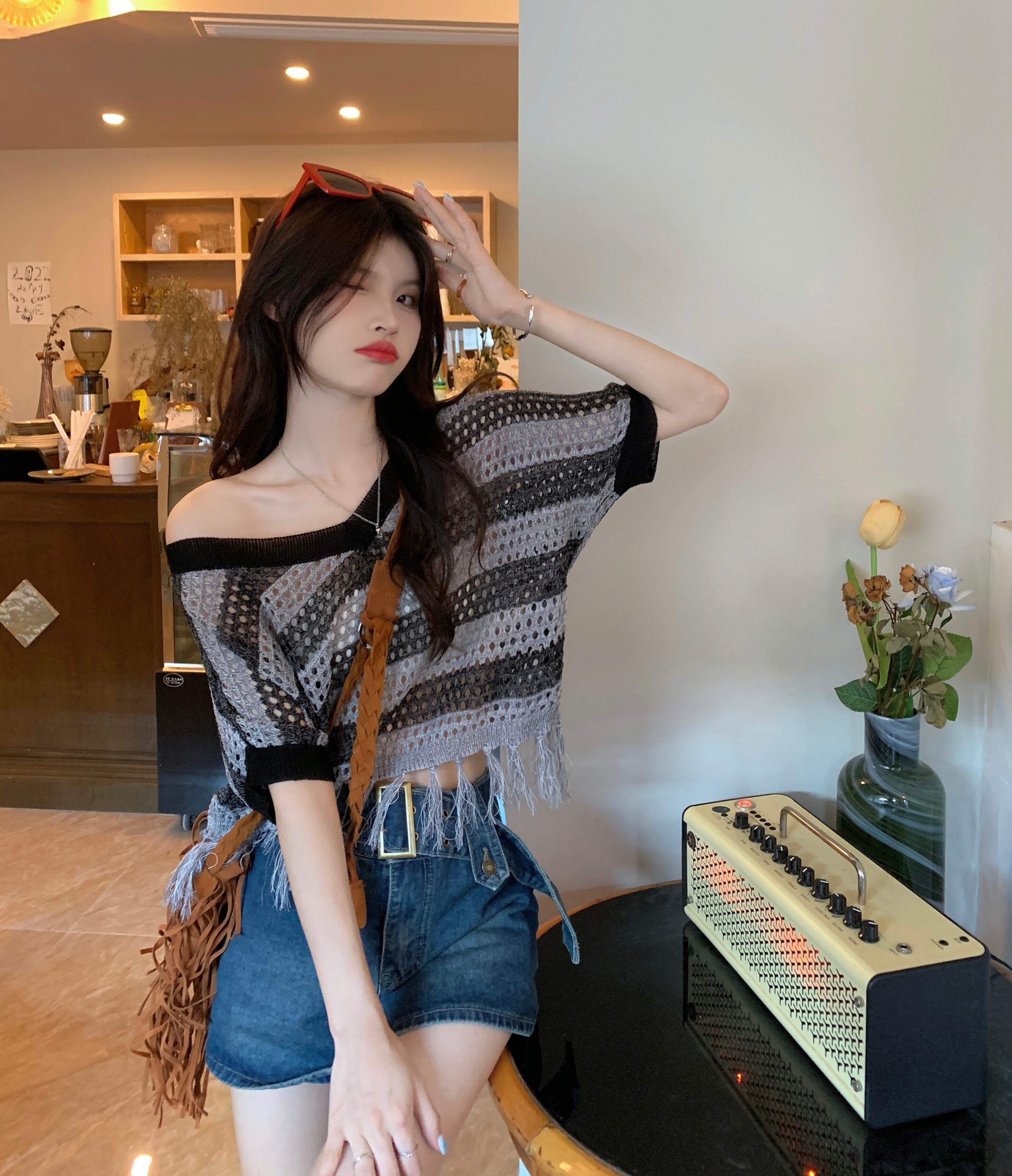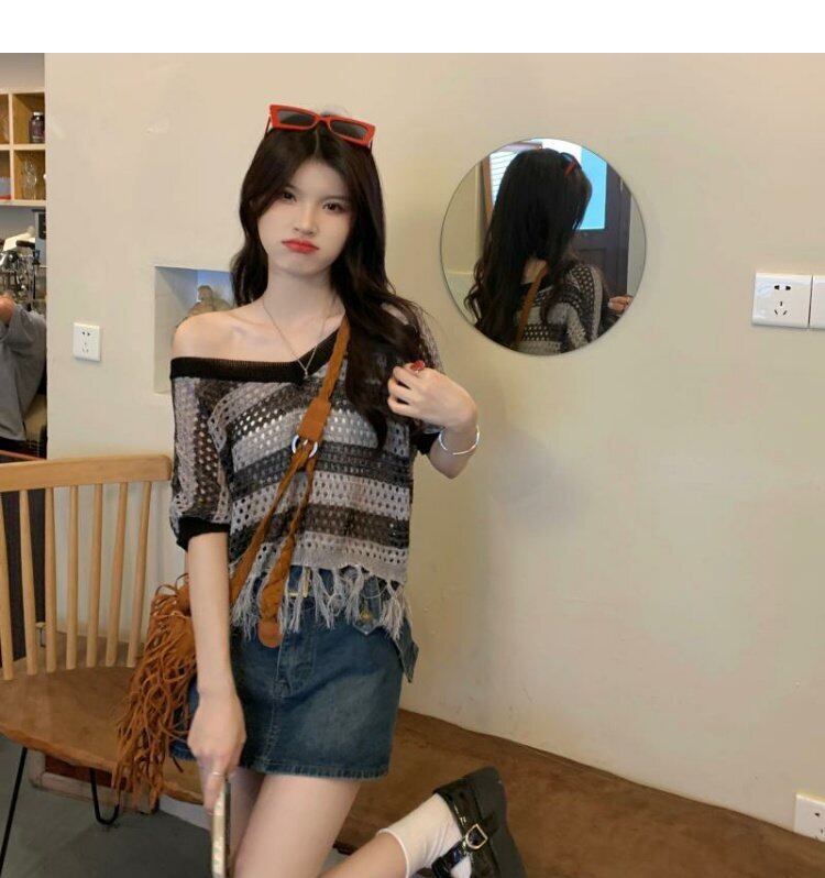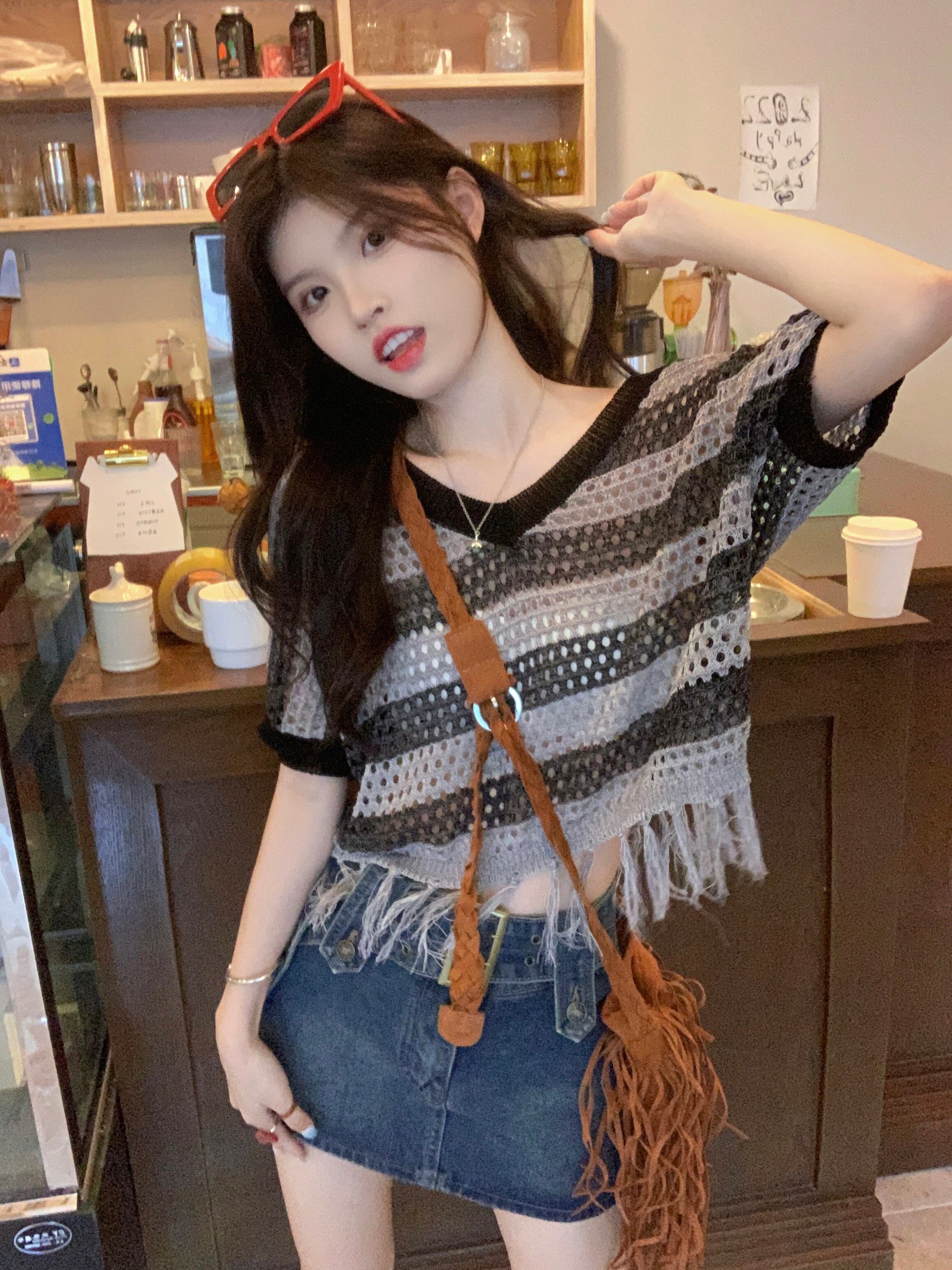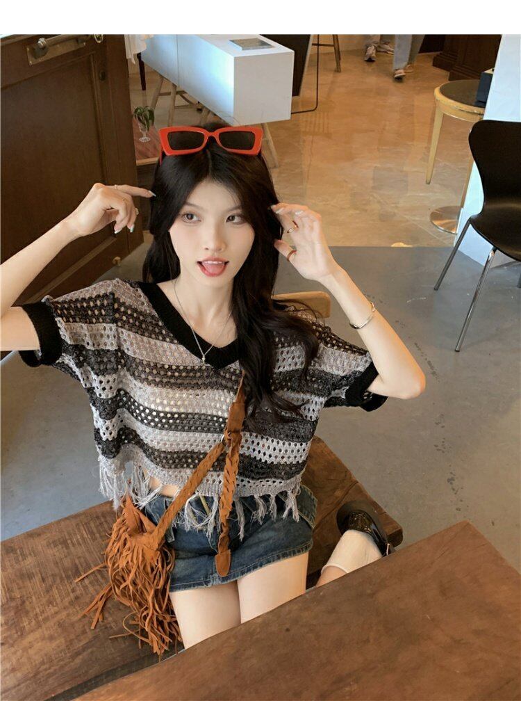 ストライプ半袖スリーブニット サマー薄手ブラウス Vネッククロップドトップス ショート ハーフスリーブ 夏物 s576198641572869