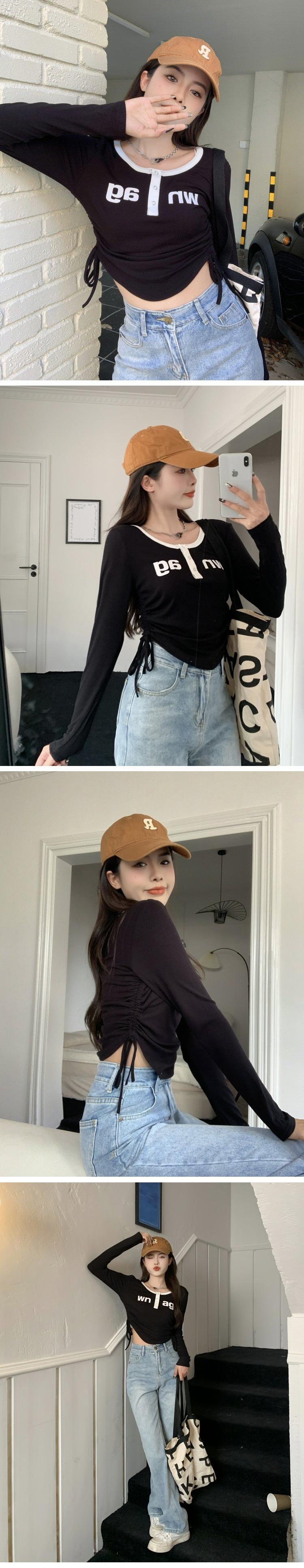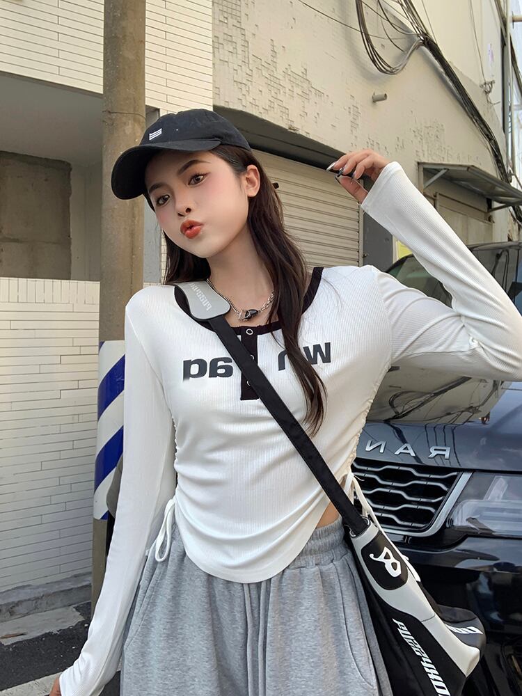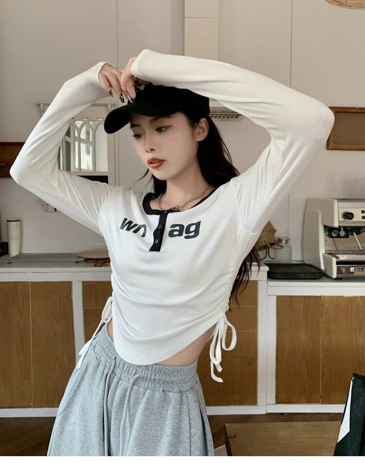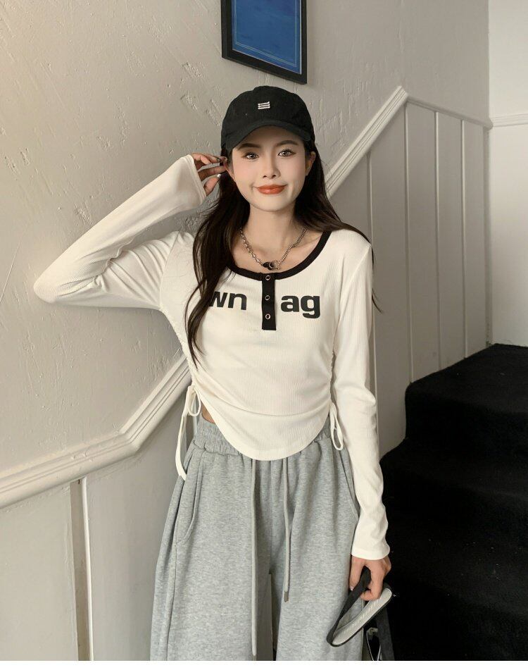ホワイト長袖スリーブTシャツ オータムスリムギャザーショートトップス ロング 秋物 ピュア s576181537624867