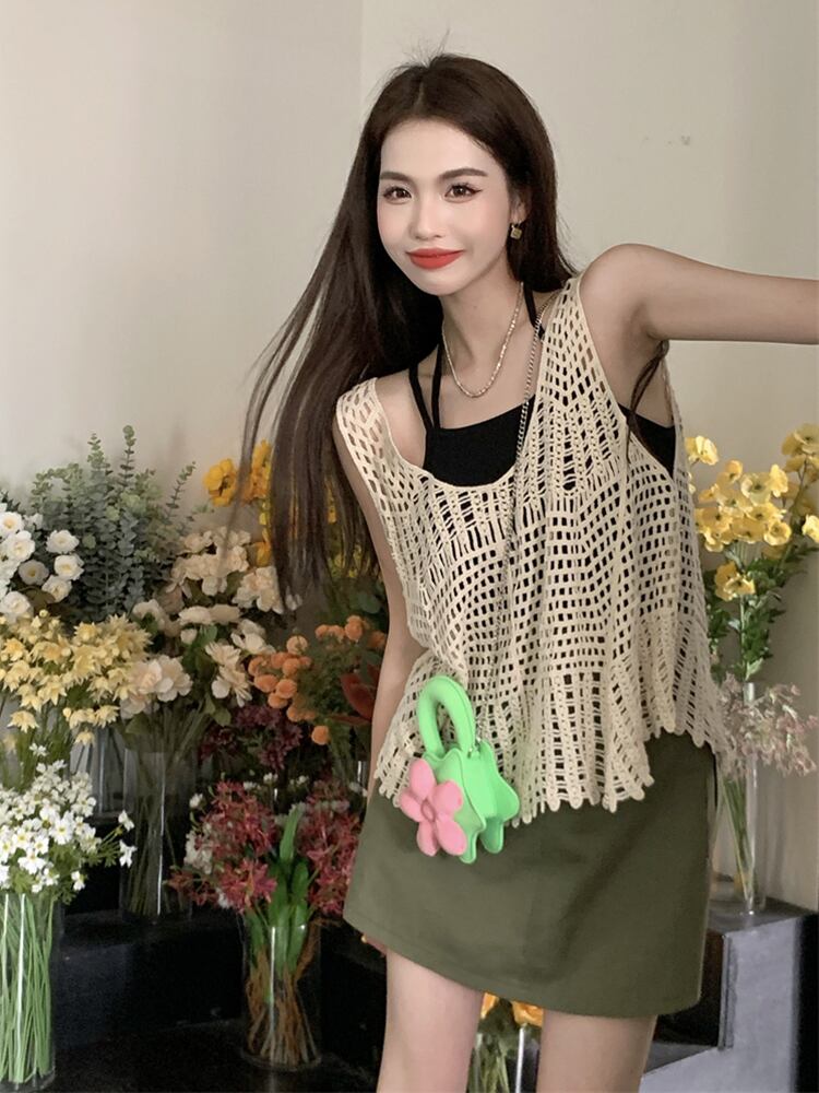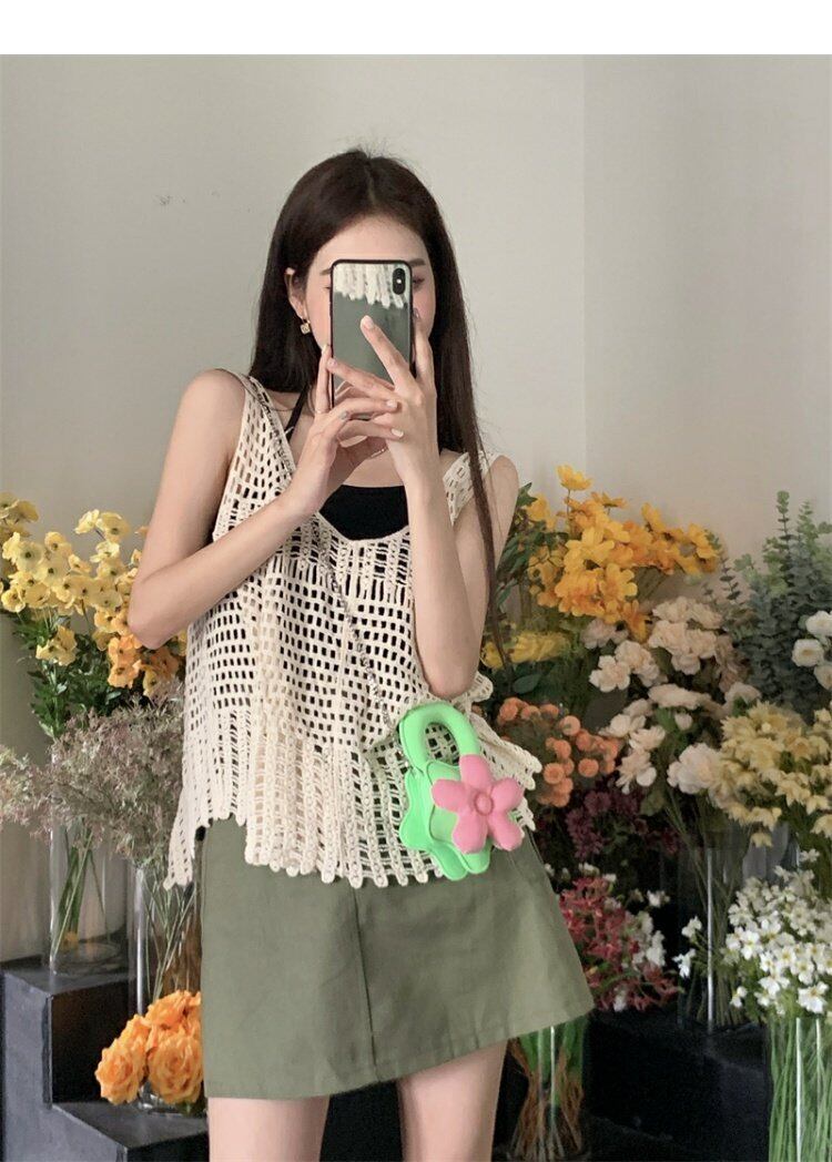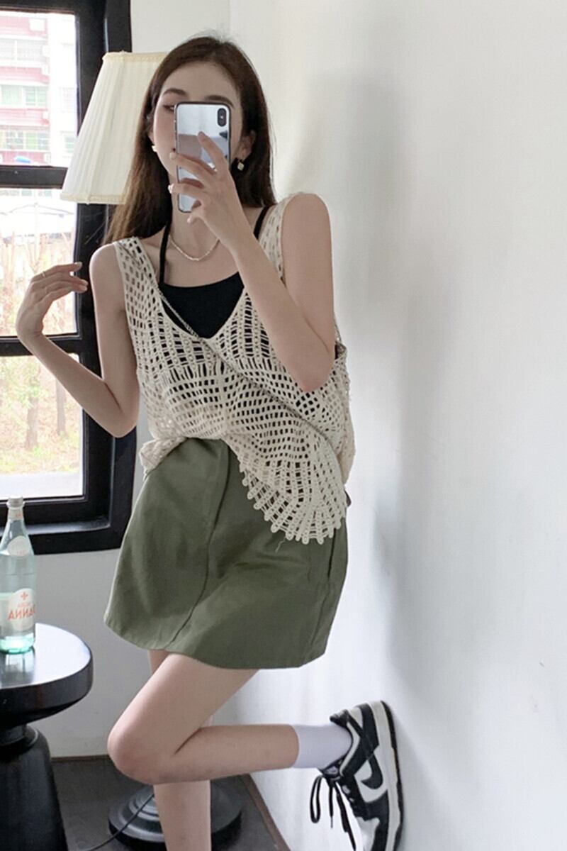 ニットサマー薄手レッドノースリーブトップス 夏物 s576164662778665