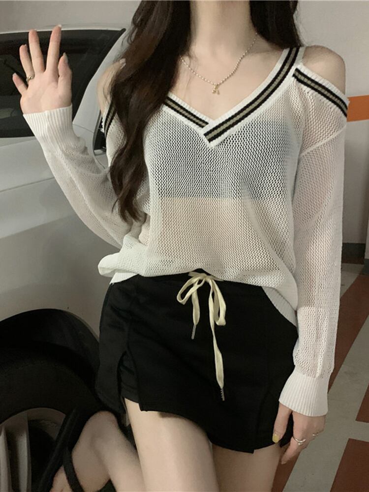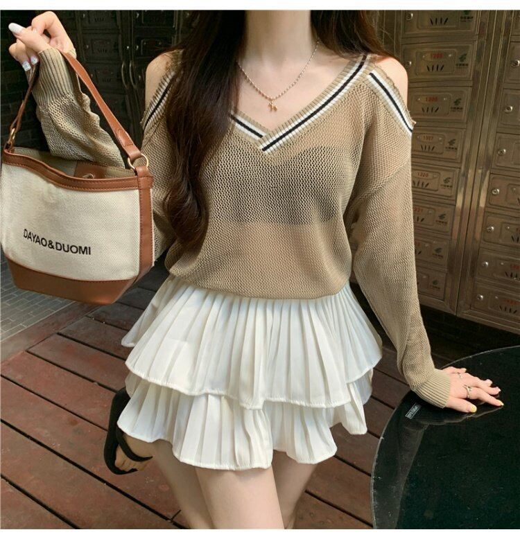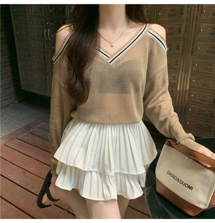 ブラックブラウス サマー薄手セーター Vネッククロップドトップス ロング 夏物 オフショルダー s576114616283975