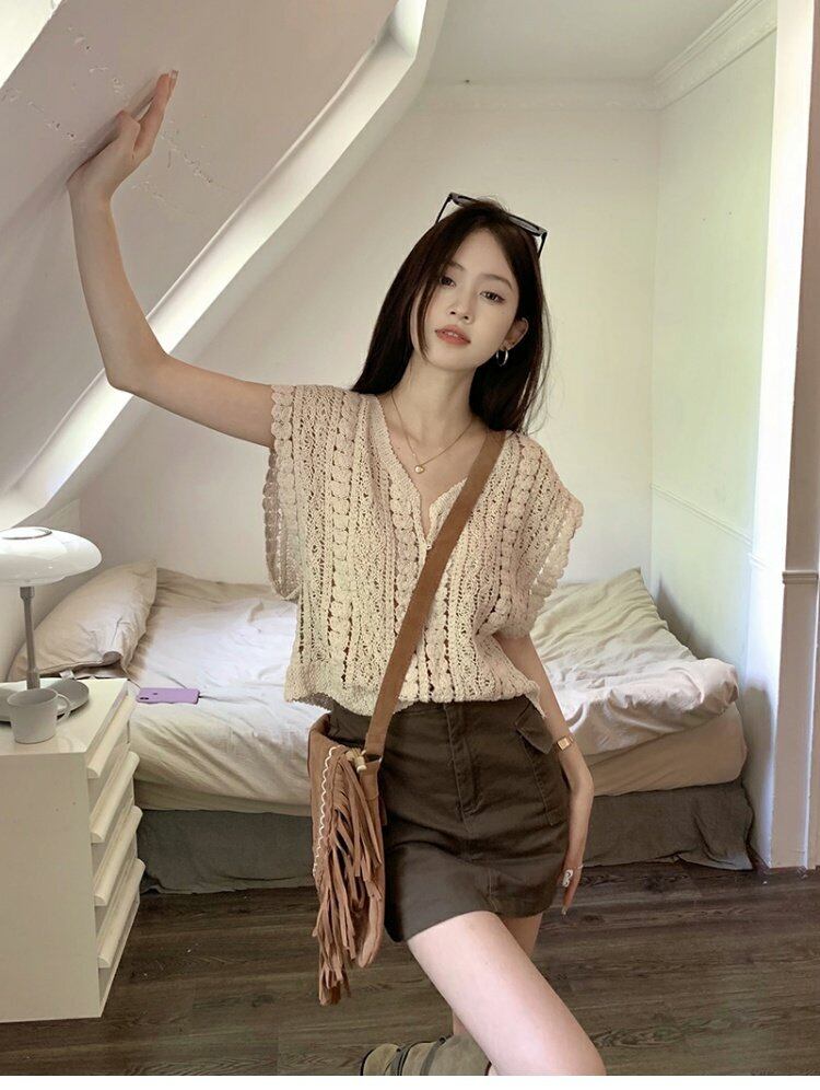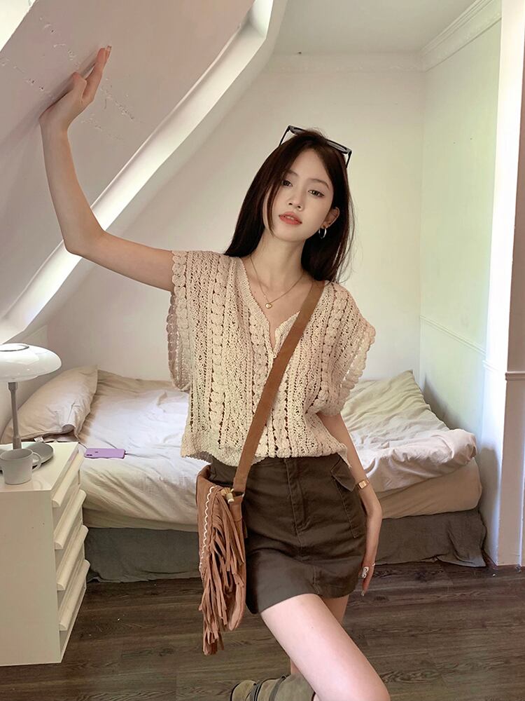 ホワイトノースリーブニットセーター サマー薄手ショートトップス 夏物 s576134080534789