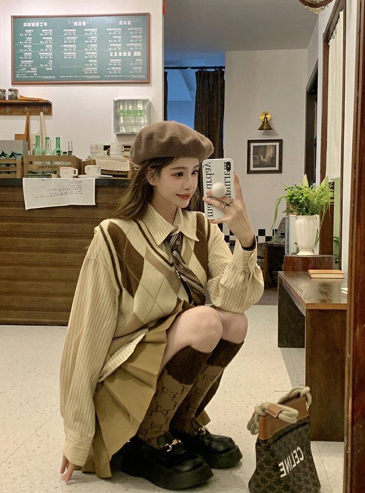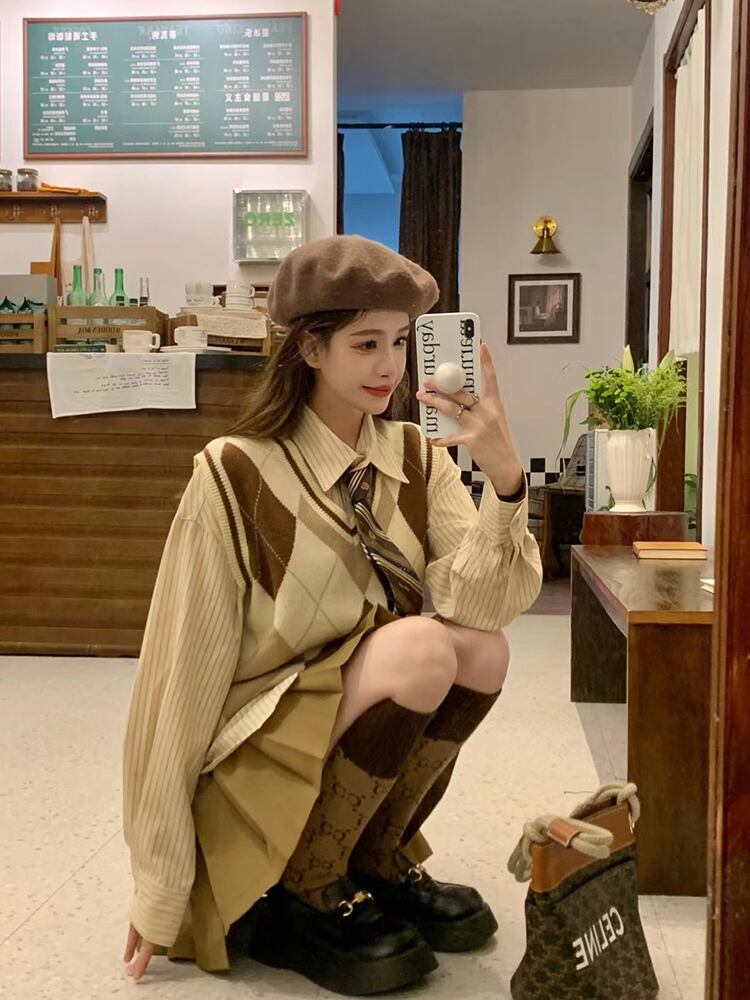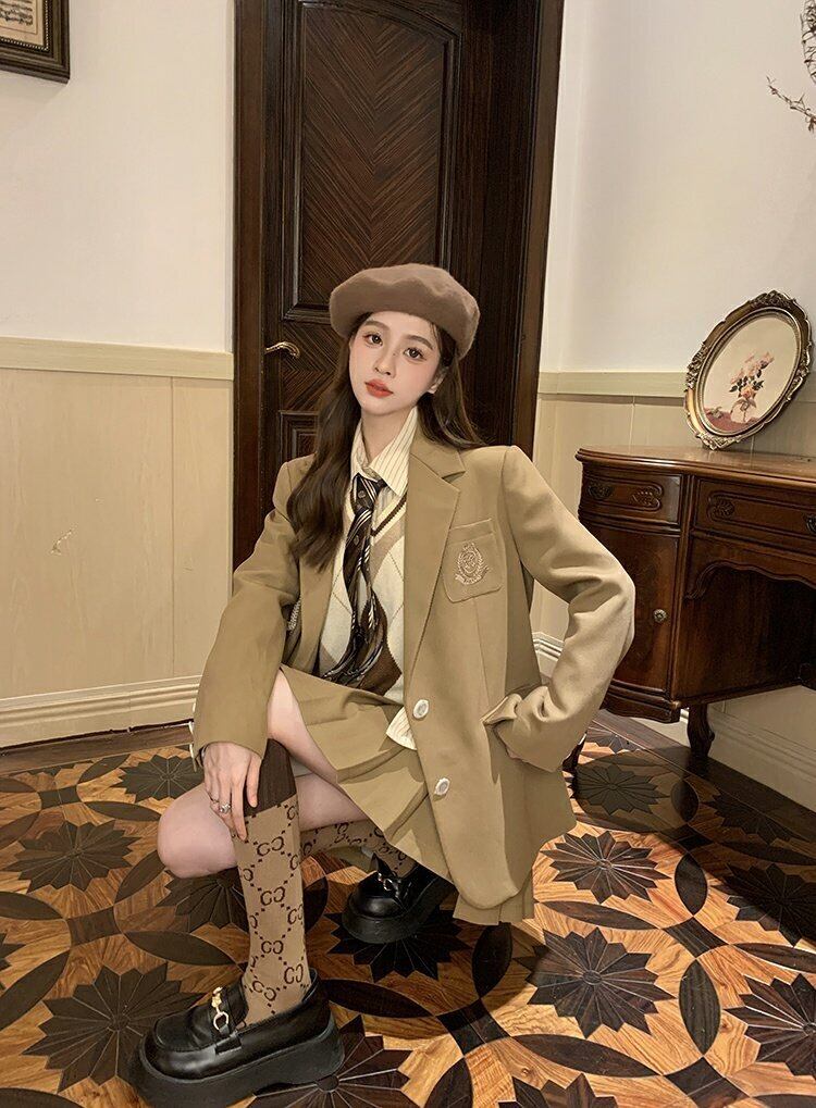 色:カーキBlazer,アプリコットbottomモカvest,カーキpleatedスカート,カーキshirt/tie