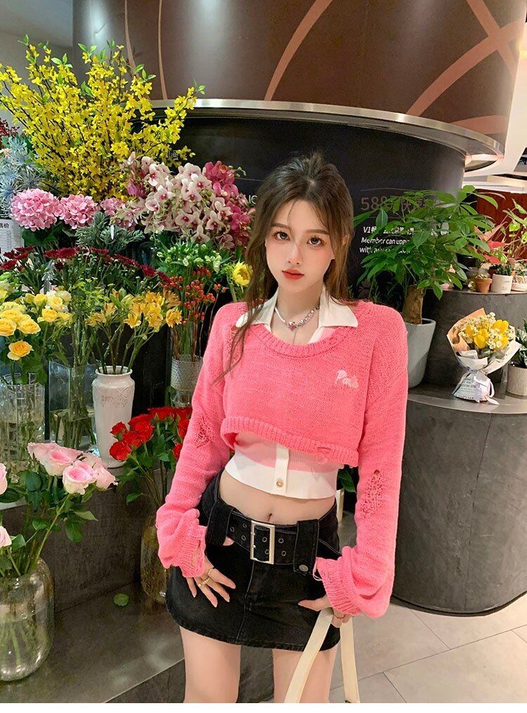 ショートセーター オータムスタイルブラウス ニットトップス ピンク レッド 秋物 s576174891879379