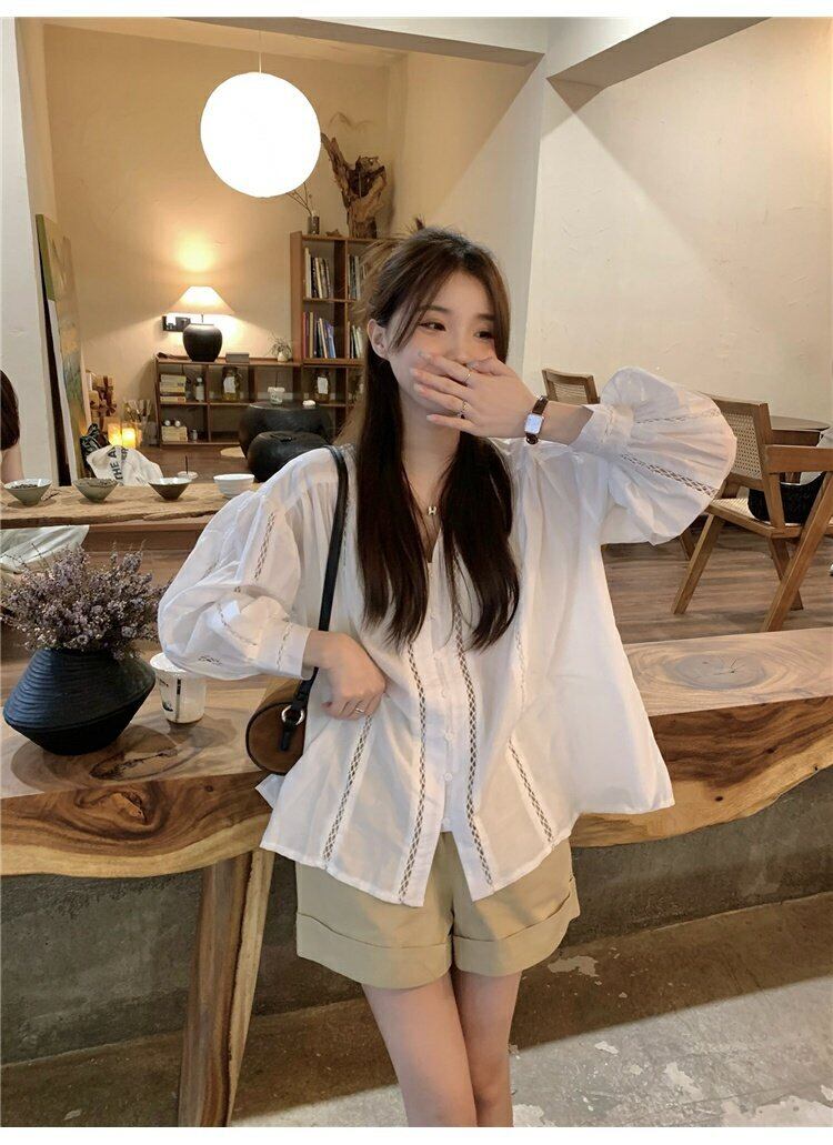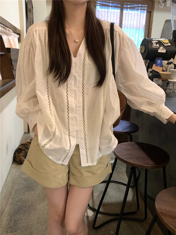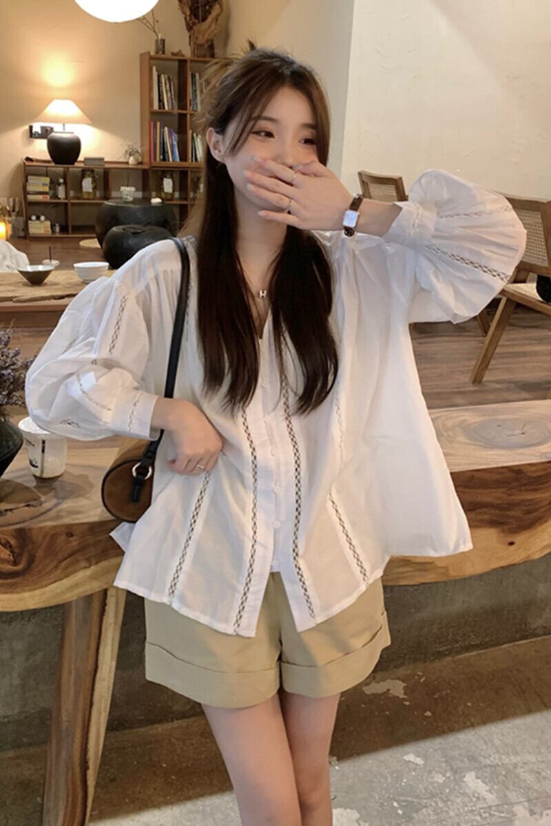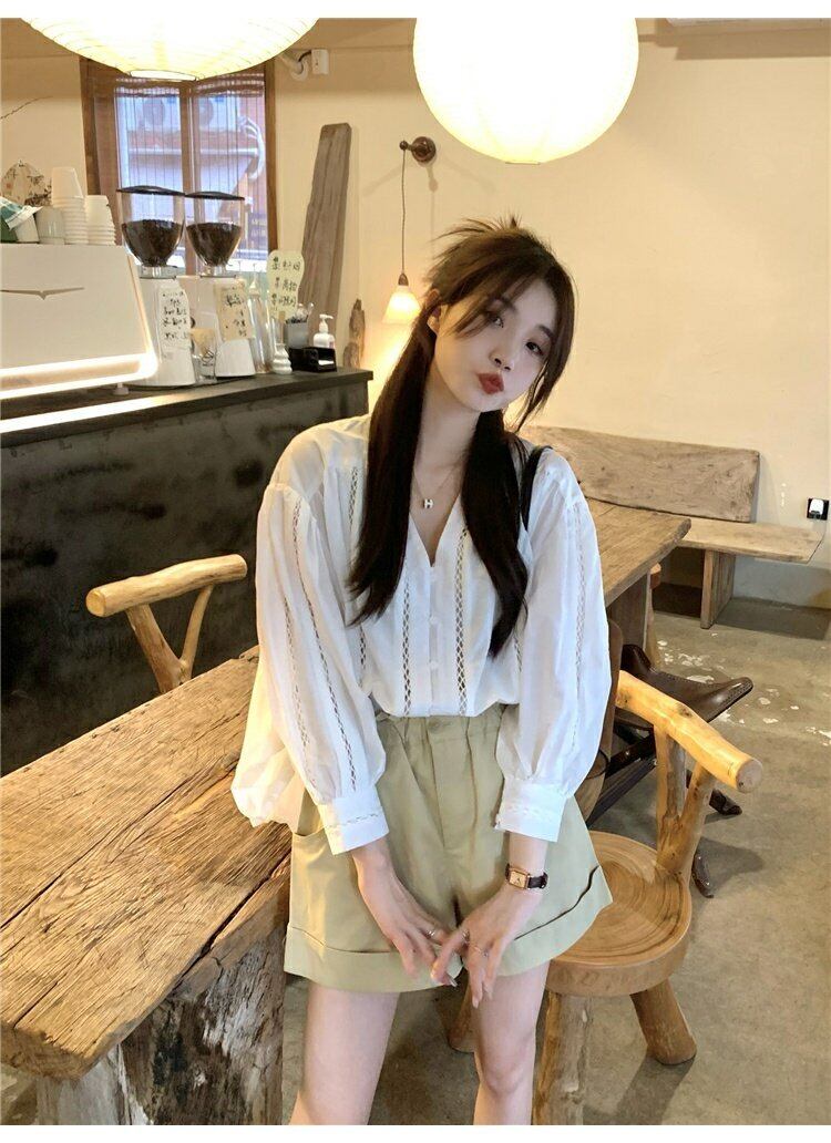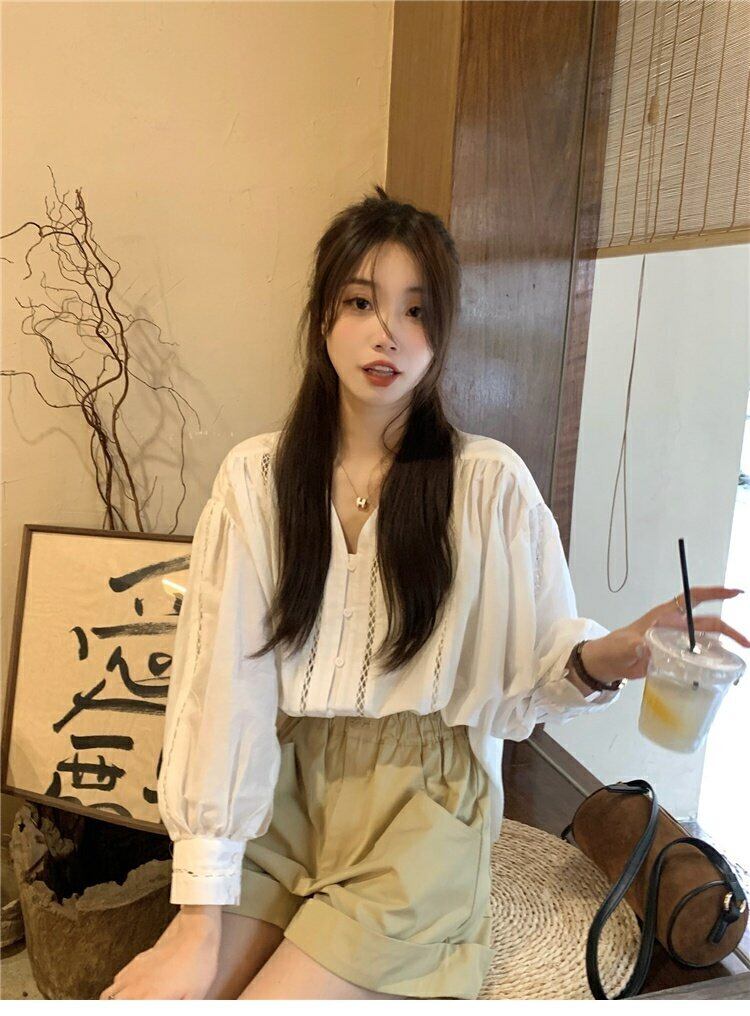 ホワイトシャツ オータムスタイルVネックトップス ロング 大人ガーリー スウィート キュート カジュアル 秋物 s576150817273313