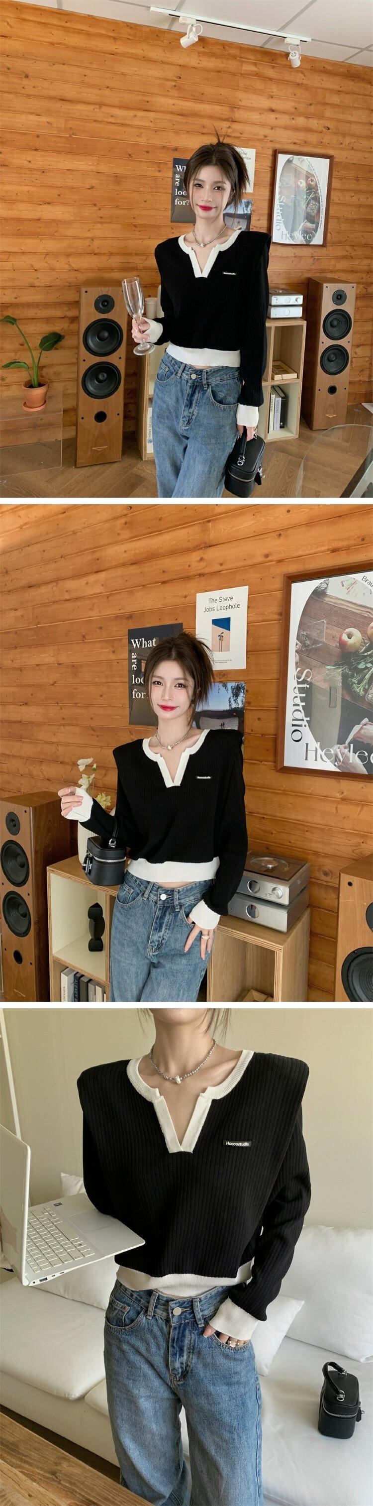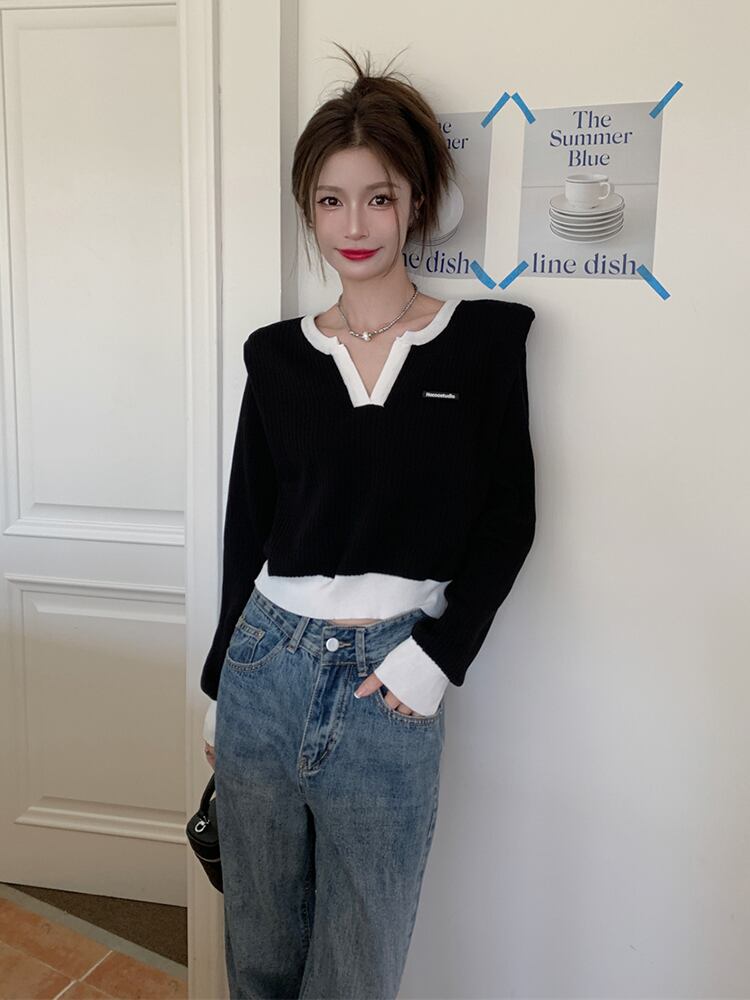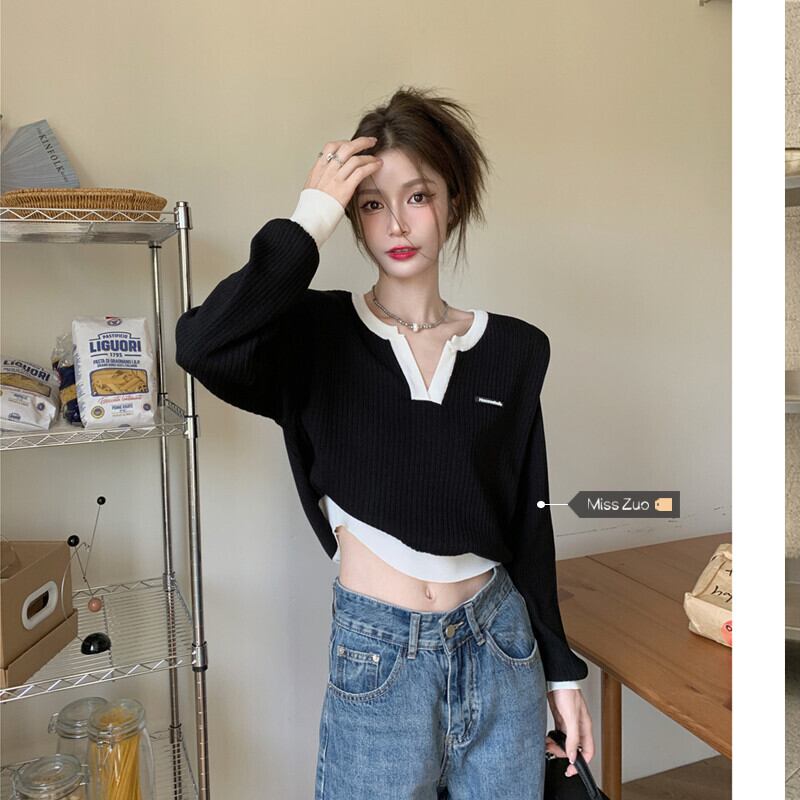 ブラックニットセーター オータムスタイルショートトップス ロング 秋物 s576174067688789