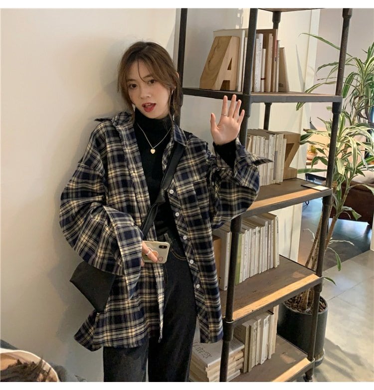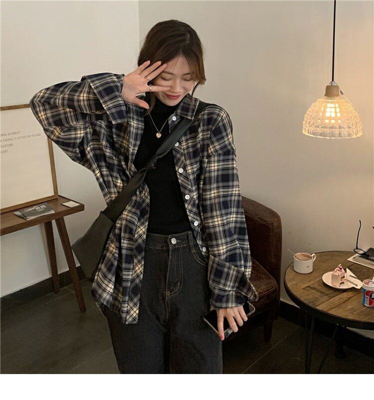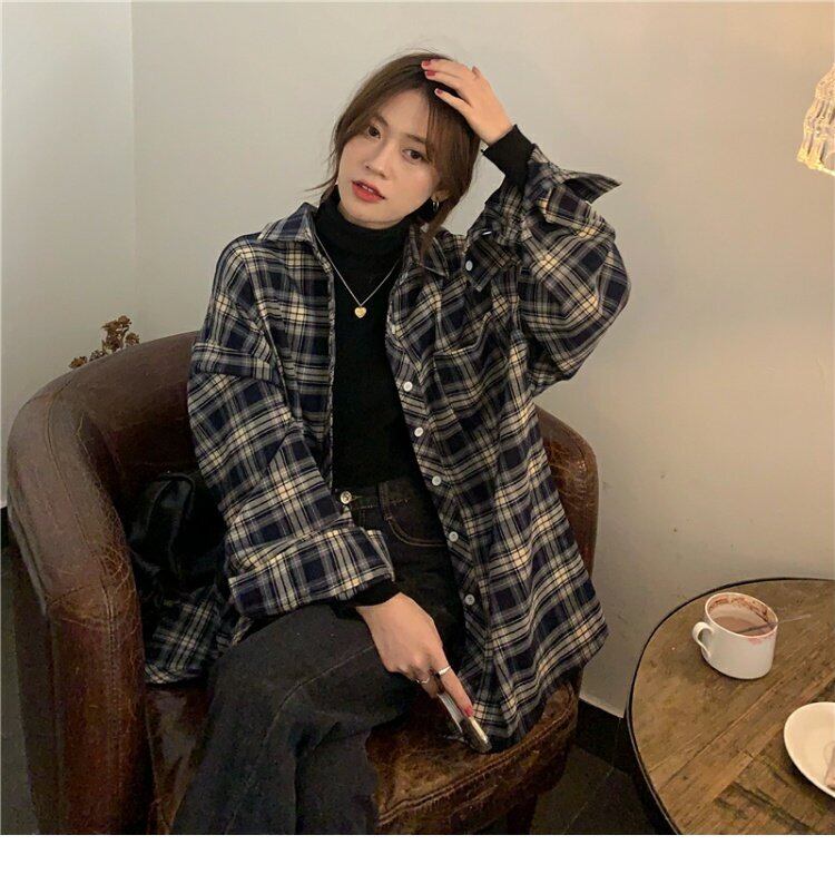 格子柄シャツ ジャケット スプリングオータムスタンダードルーズトップス ロング レトロ 春物 秋物 s57616266647591