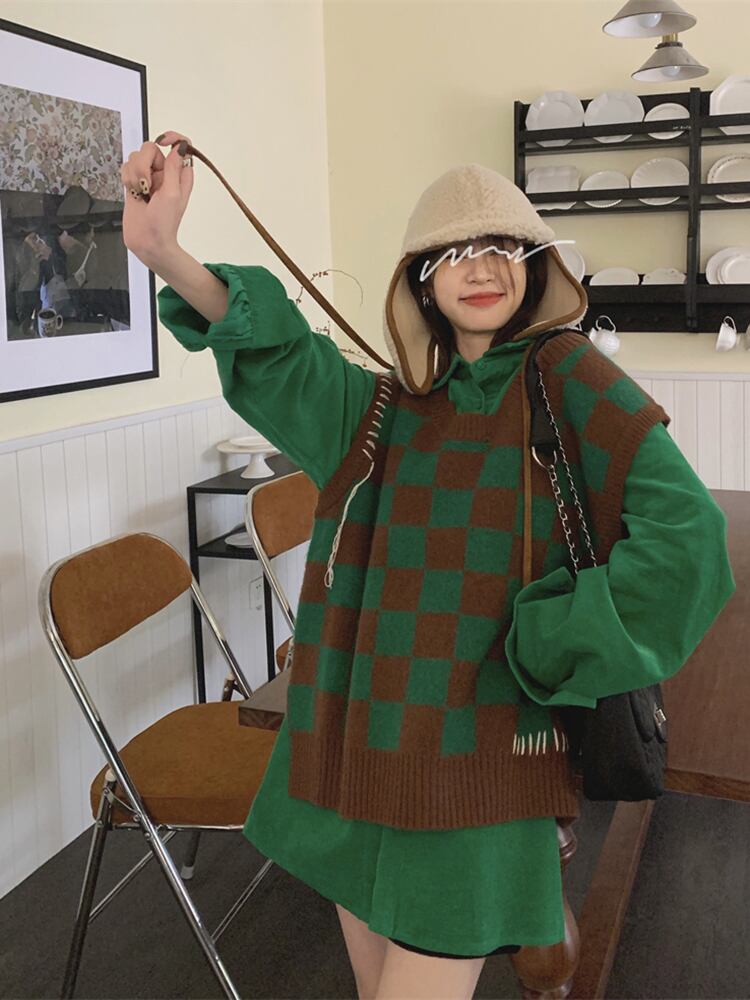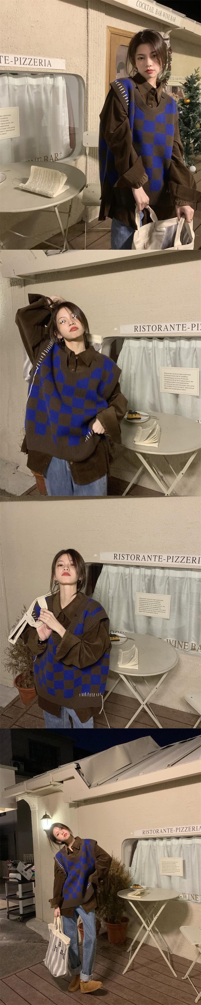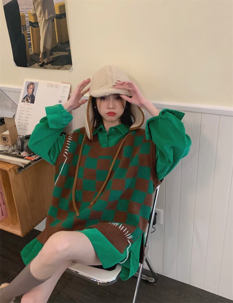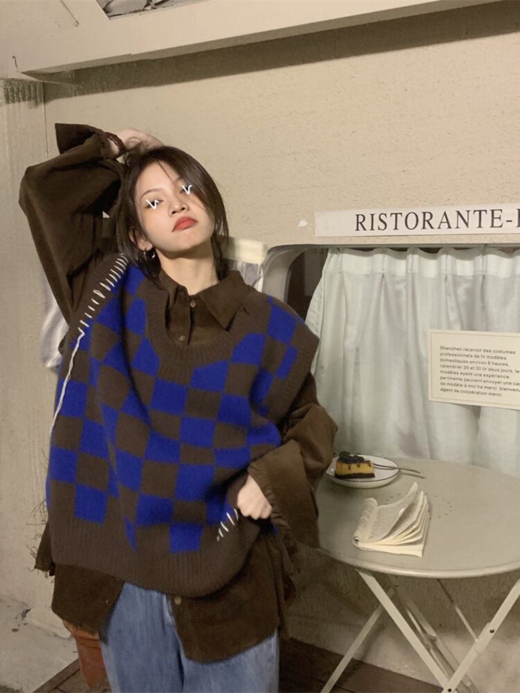 チェッカーボード ニット ベスト レディース 秋 シャツ レイヤード ベスト ルーズ レイジー ウィンド セーター ベスト ベスト レッド オータム 秋物 s576178767088986