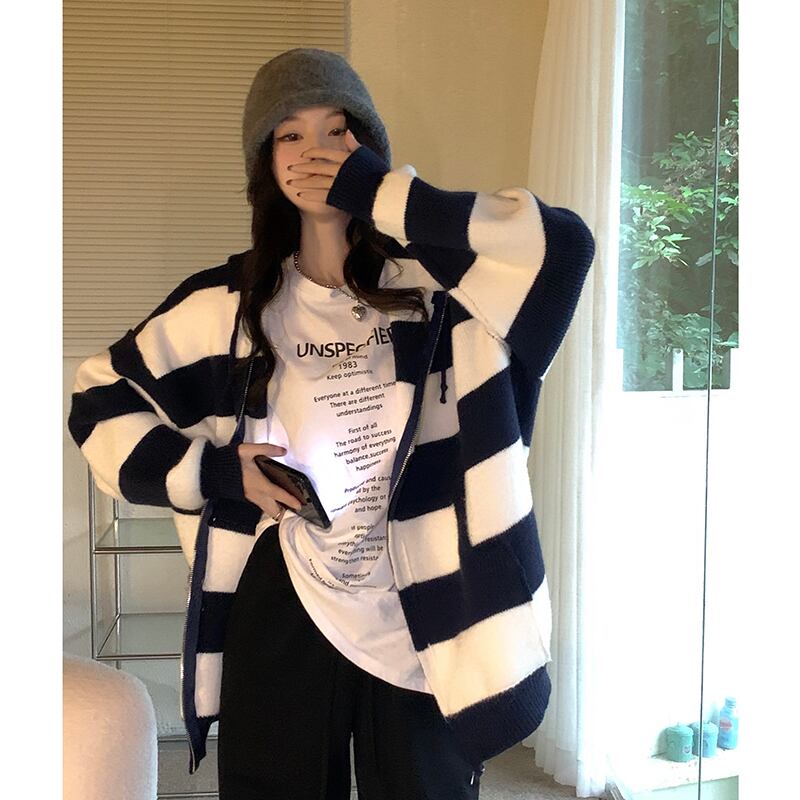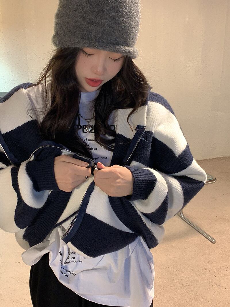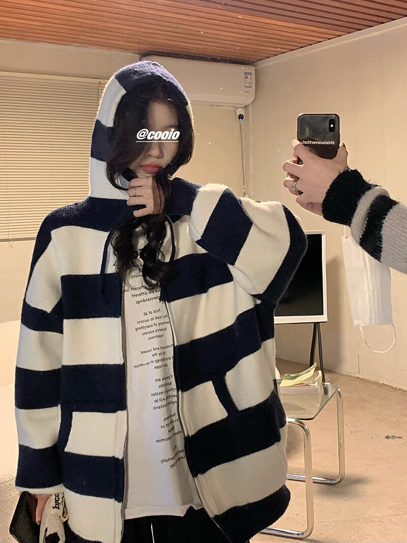 ストライプ フード付き セーター ジャケット レディース デザイン センス ニッチ 秋 ゆったり アウター 和風 レトロ 怠惰 ニット カーディガン オータム 秋物 s576128551243448