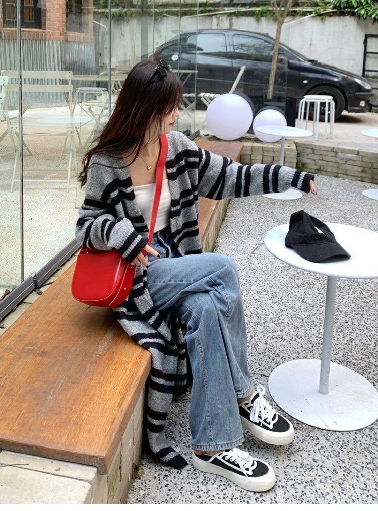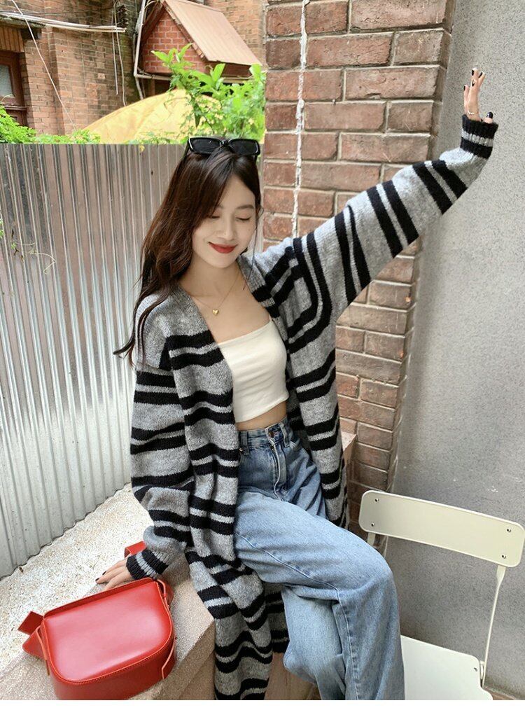 ストライプセーター コート オータムスタンダードルーズスタイルロングニットカーディガン レトロ 秋物 s576190552877937