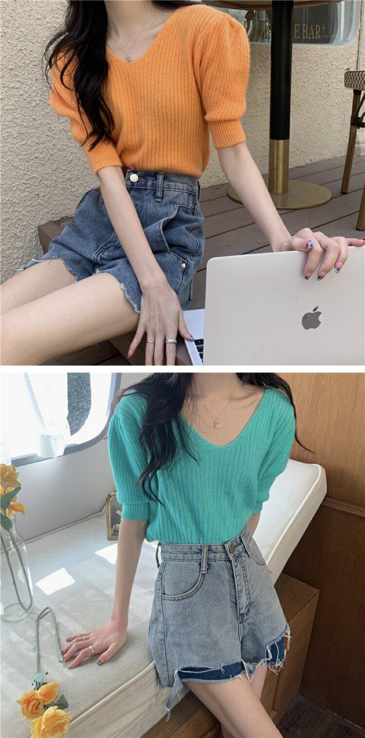 ブラックショートニットセーター サマースタイルレッドVネックトップス 夏物 s576122226874149