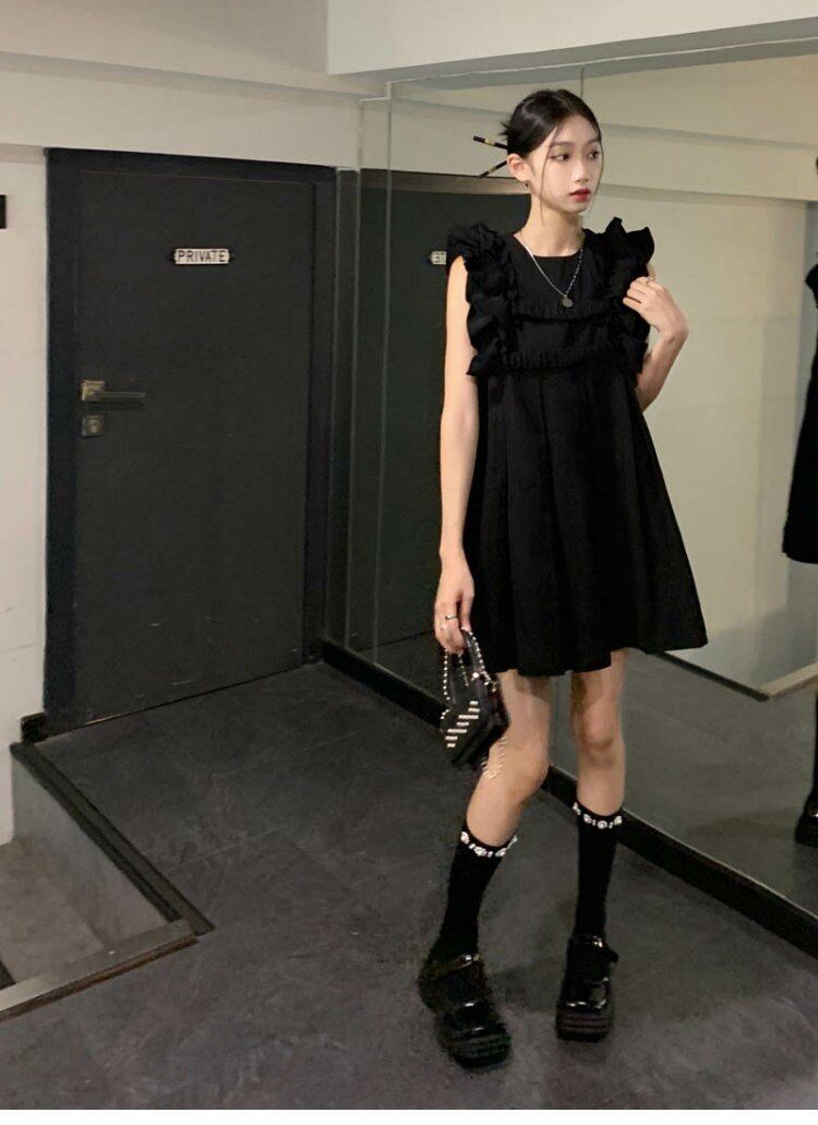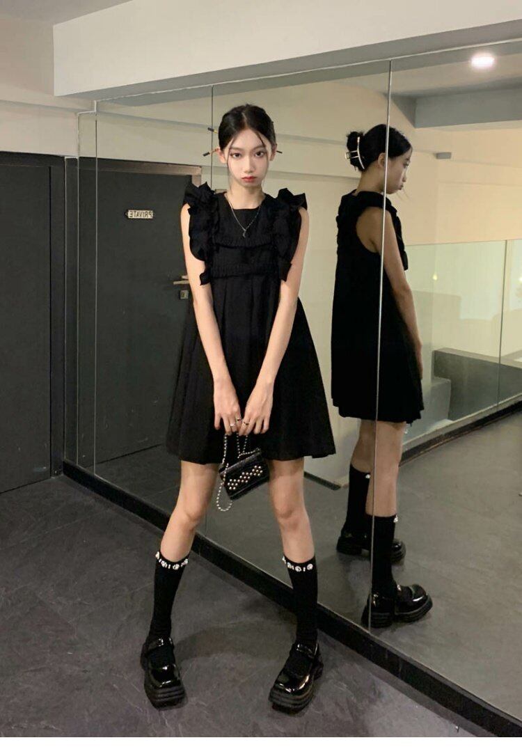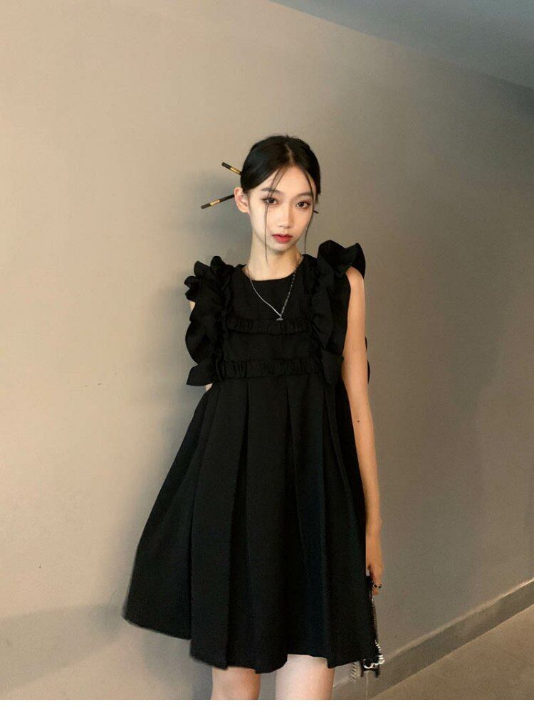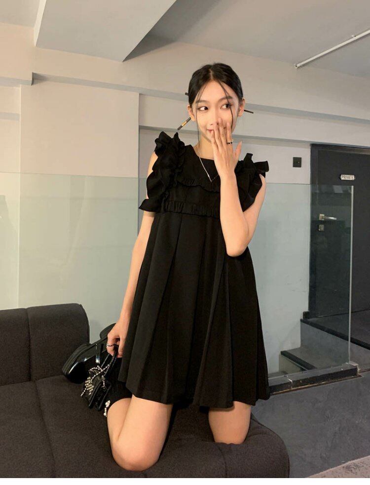 ダークプリーツスカート サマーブラックショートドレス 夏物 s576126463628827