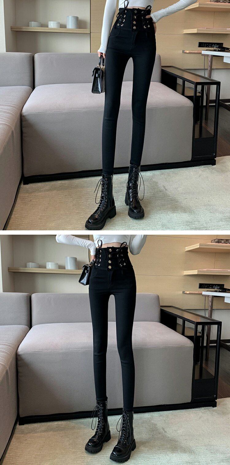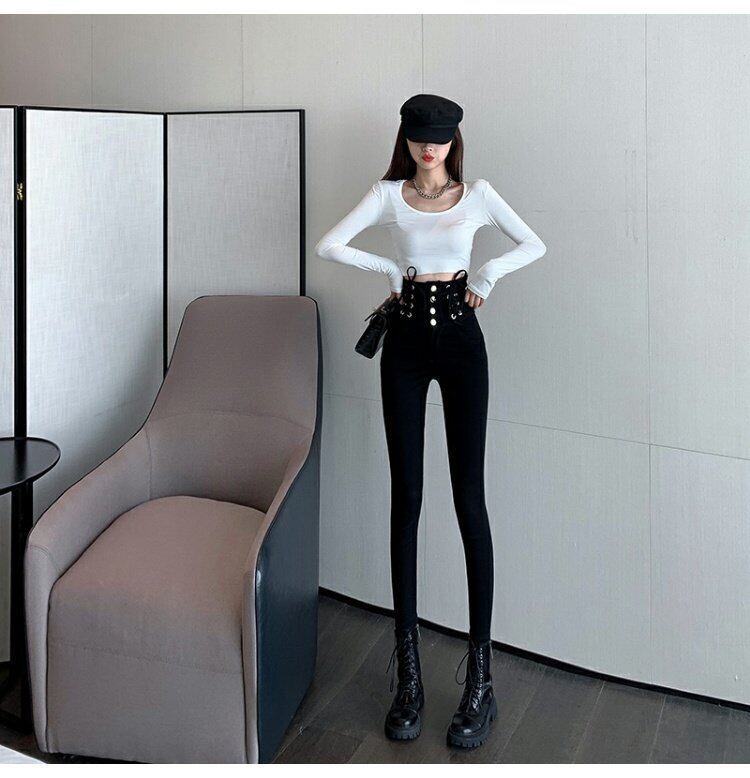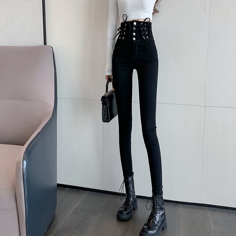ウェストジーンズ スプリングオータムスリムフィットブラックロングパンツ ハイウェスト 春物 秋物 s57612156468120