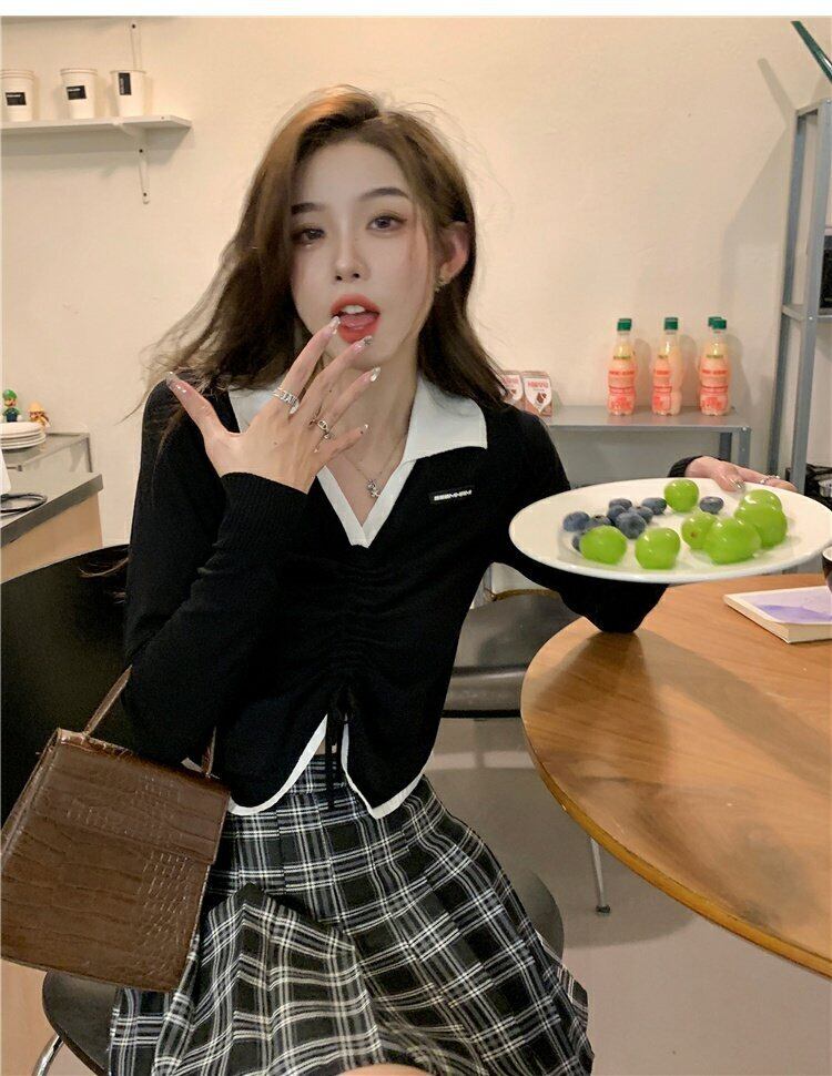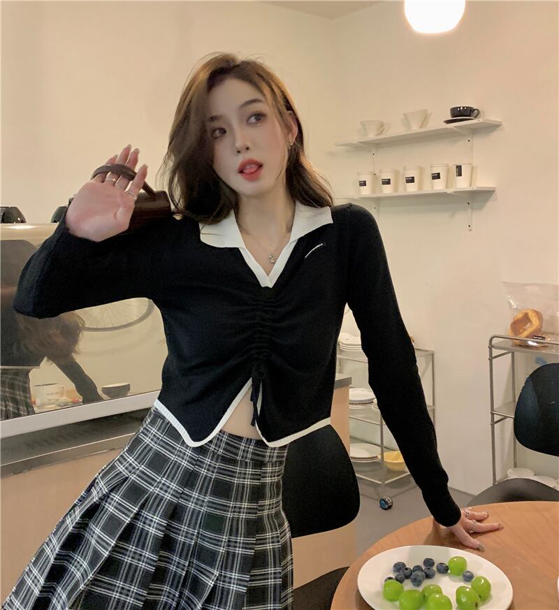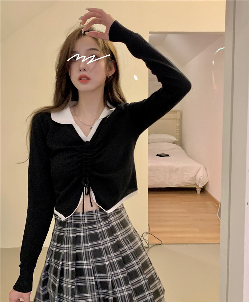 ギャザーショートトップス オータムブラックニットセーター 秋物 s576157990638549