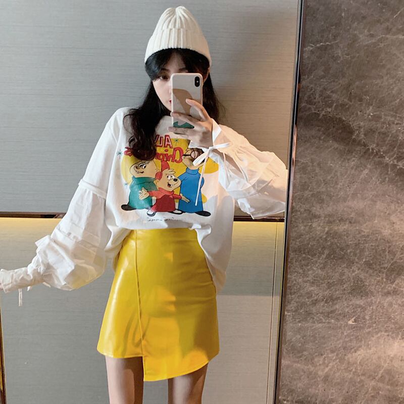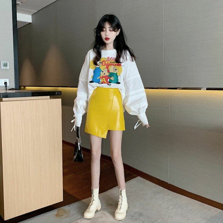 色:Letterトップ9849,イエローleatherスカート9850