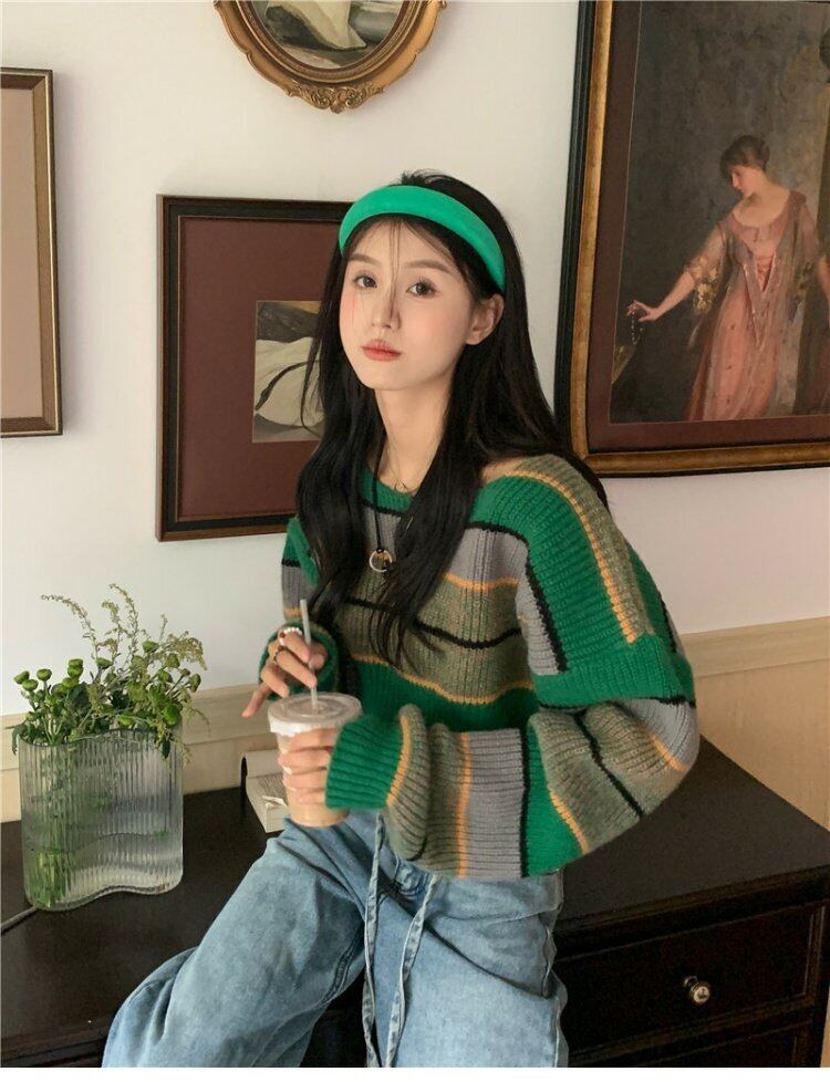 ストライプショートセーター オータムスタイルスタンダードニット レトロ 秋物 s576194887954452