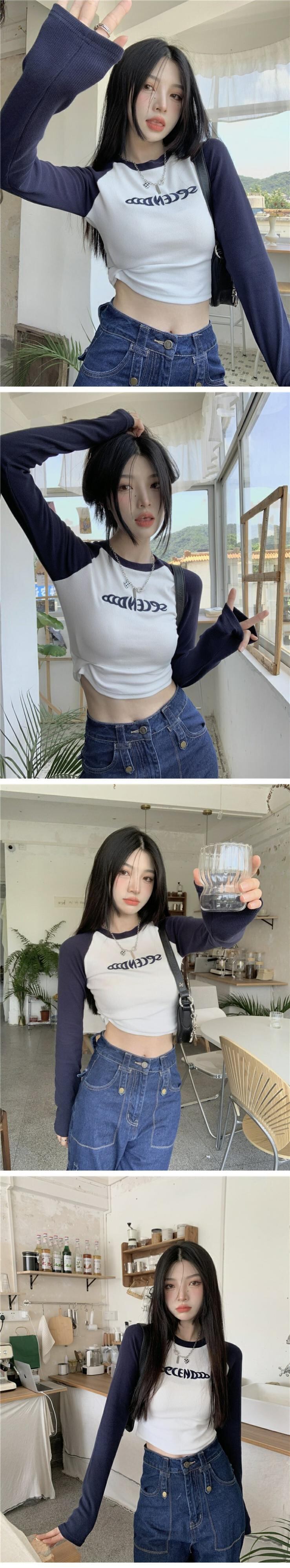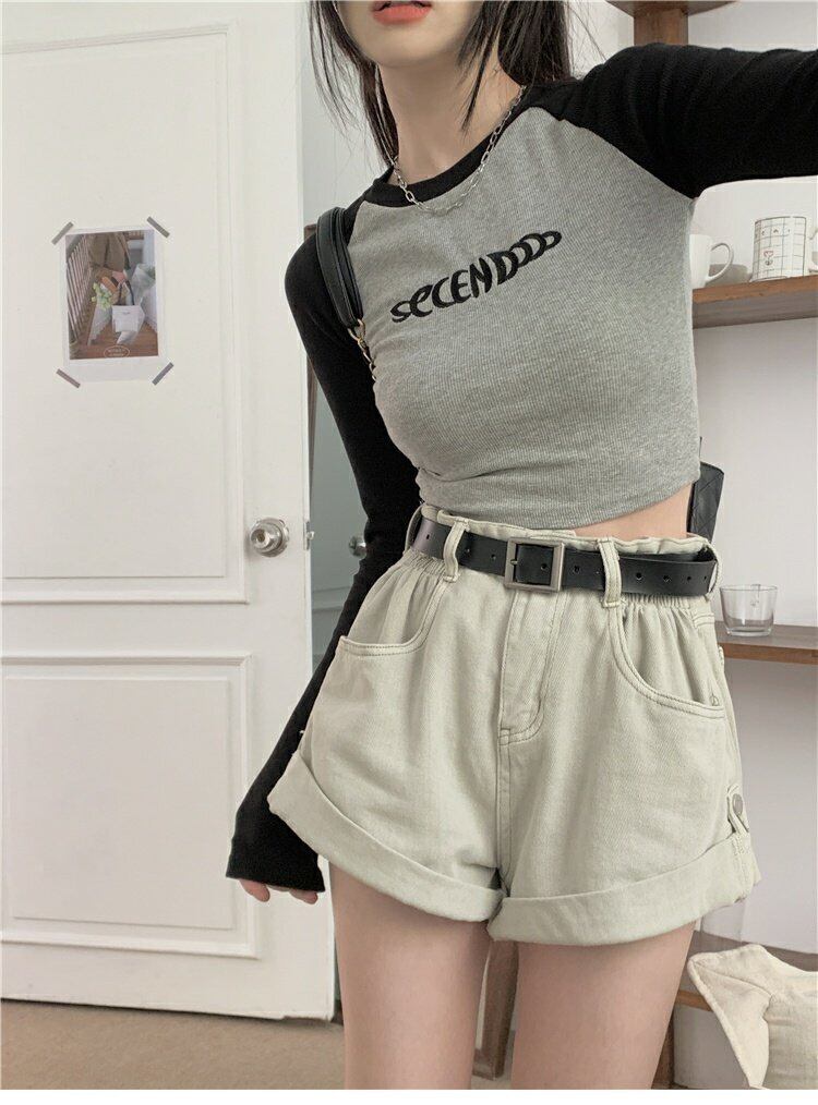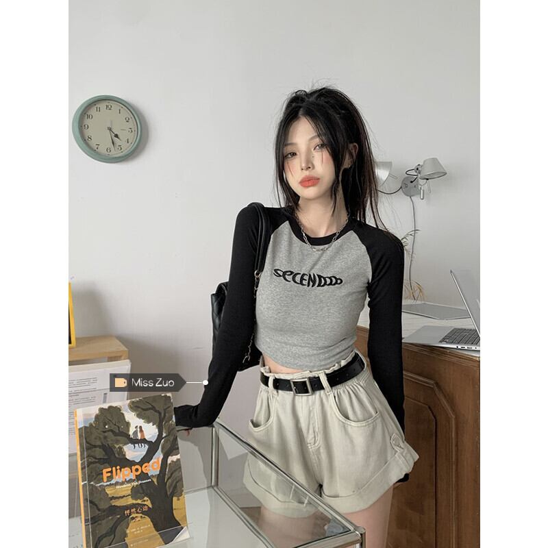 スリムフィットショートトップス オータム薄手スタンダードTシャツ ロング レトロ 秋物 s576174269859242