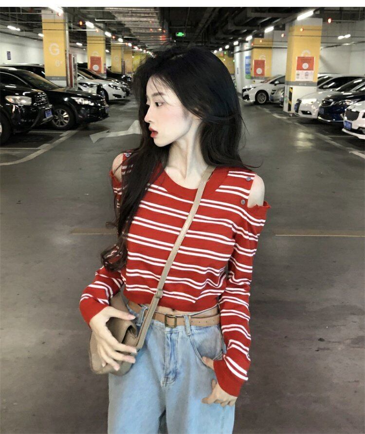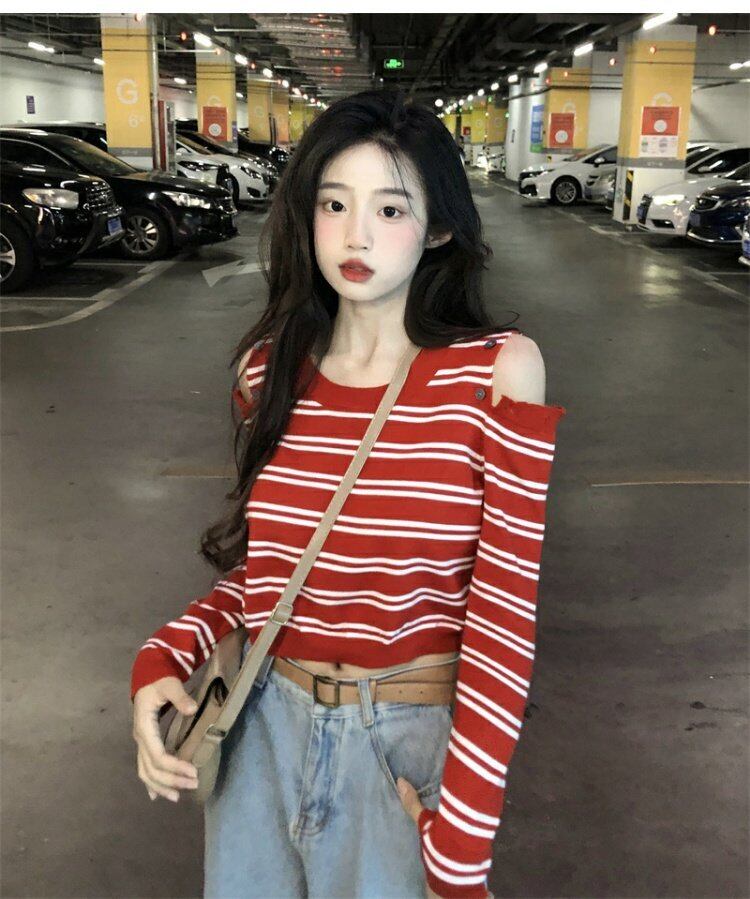 ストライプニットセーター オータムクロップドトップス ロング 秋物 s576149983577908