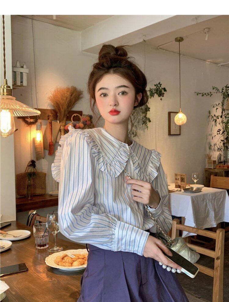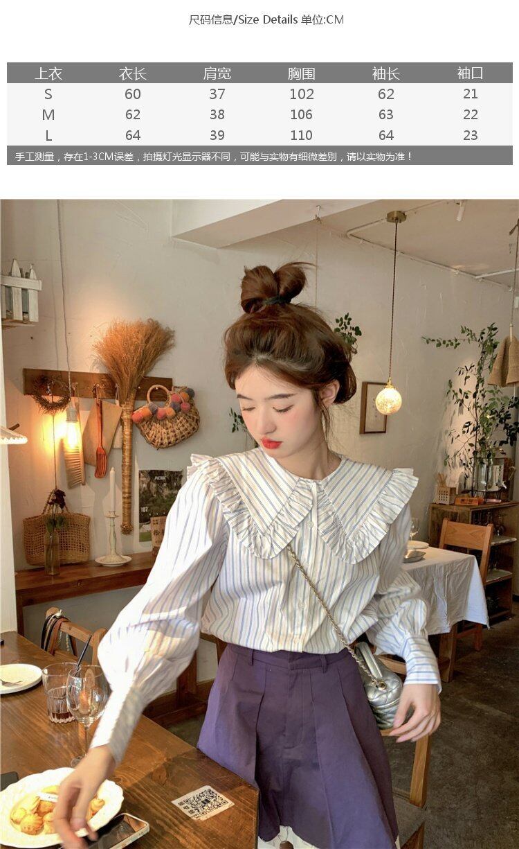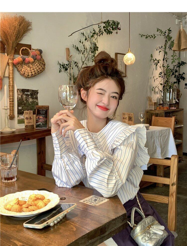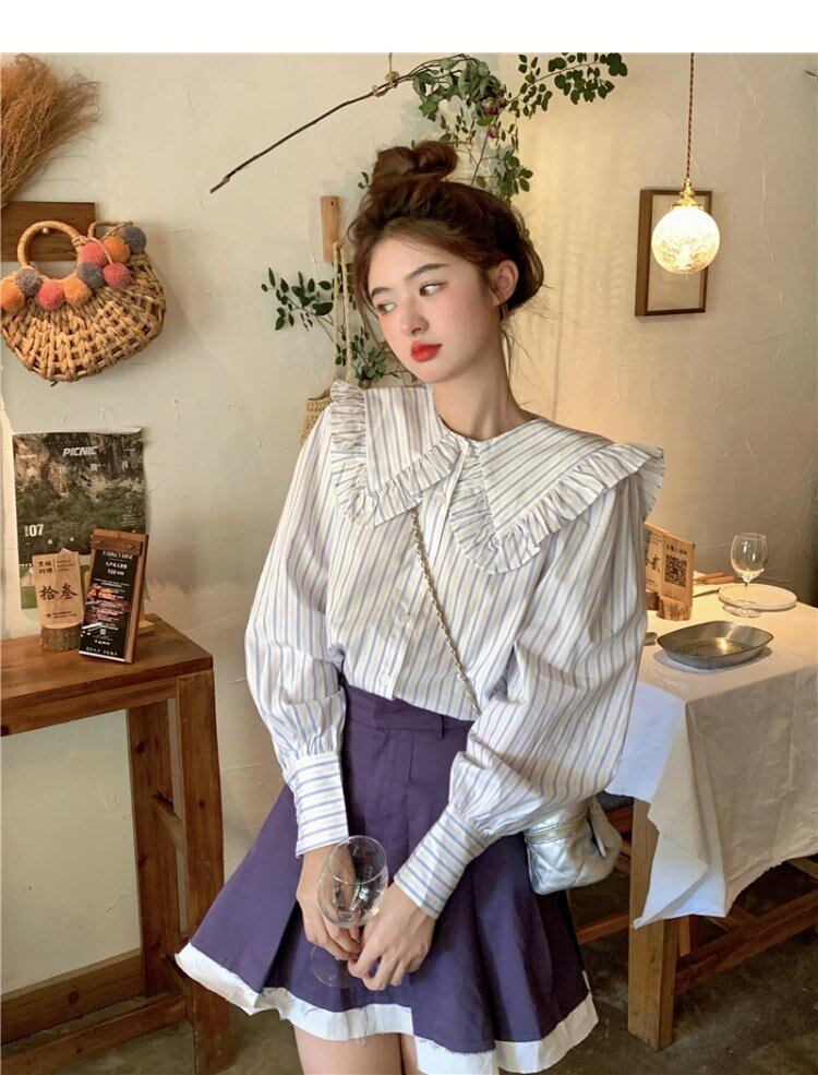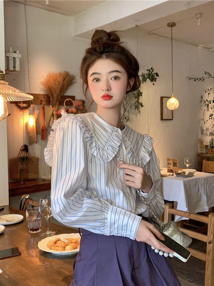 カラーストライプシャツ オータムトップス ロング 大人ガーリー スウィート キュート カジュアル 秋物 s576120881031329