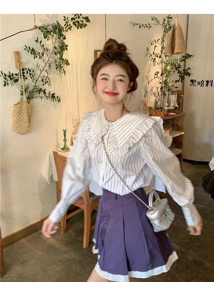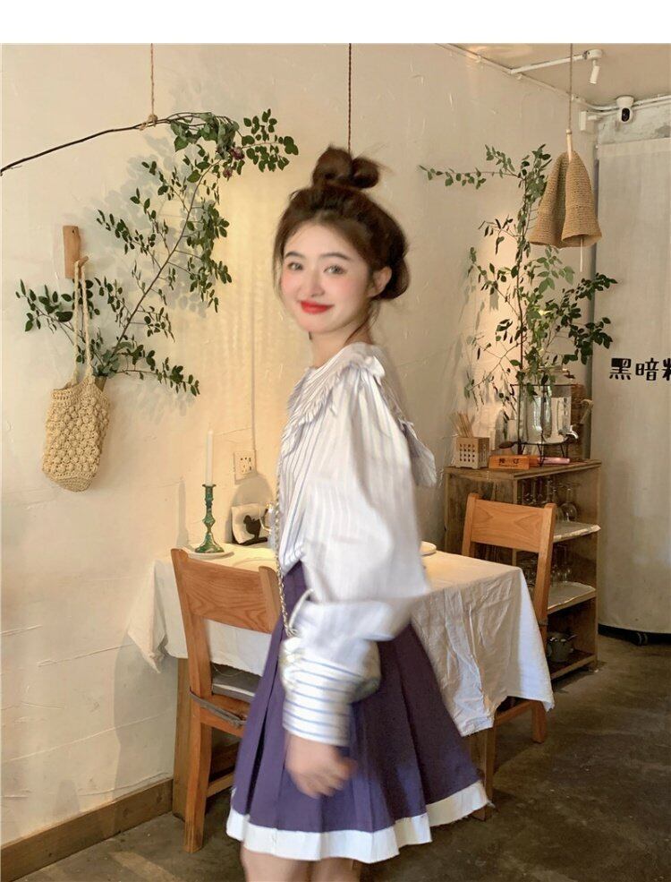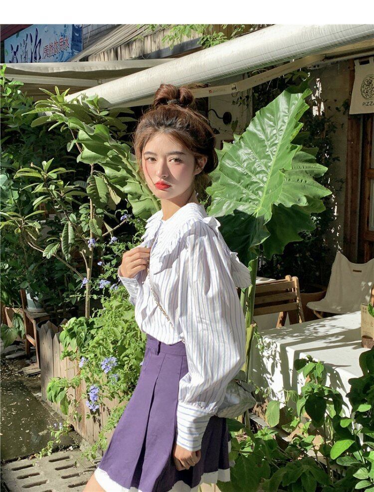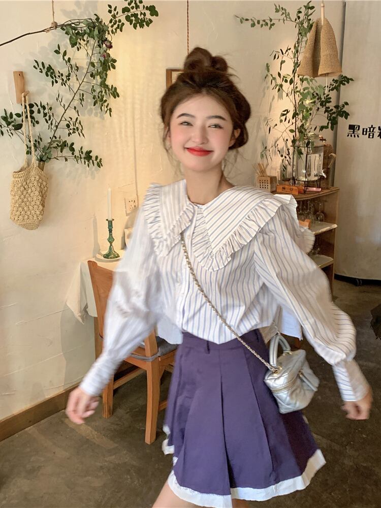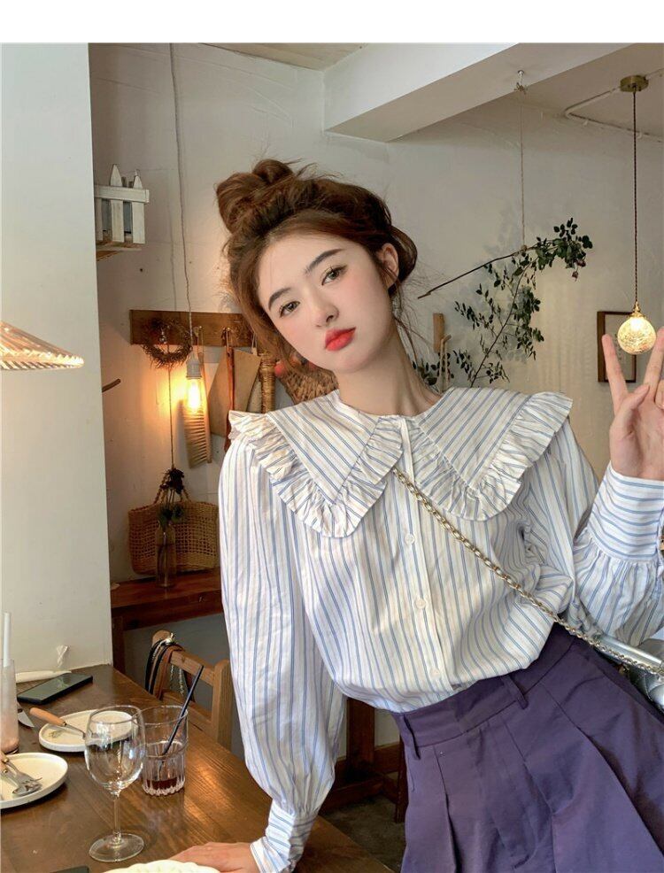 カラーストライプシャツ オータムトップス ロング 大人ガーリー スウィート キュート カジュアル 秋物 s576120881031329