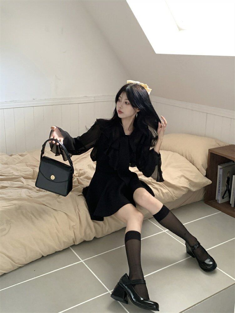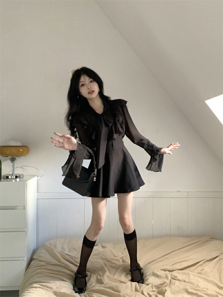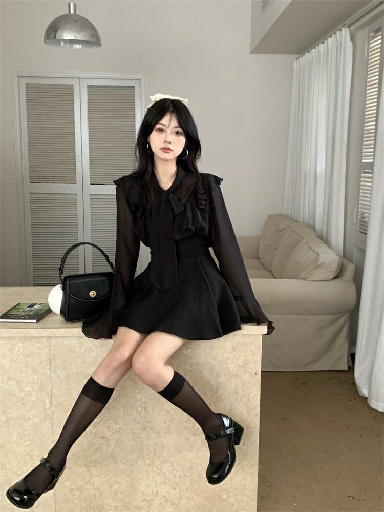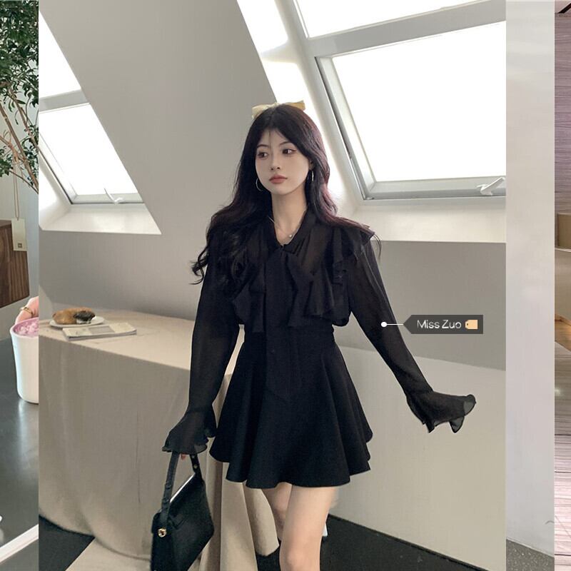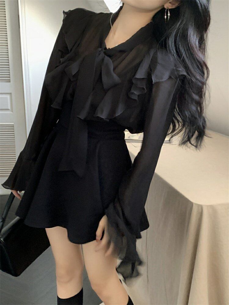 ブラックシャツ オータム薄手シフォントップス ロング 秋物 s576147254301302
