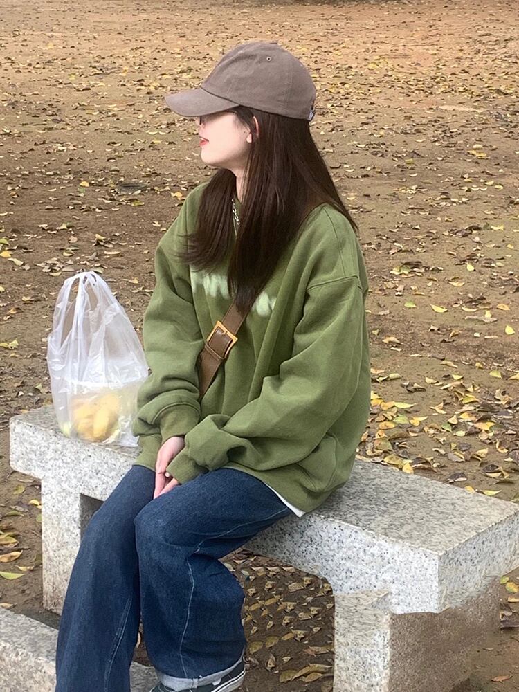 グリーンラウンドネックセーター オータムスタンダードルーズスタイルトップス ロング レトロ 秋物 Oネック s576128495650203