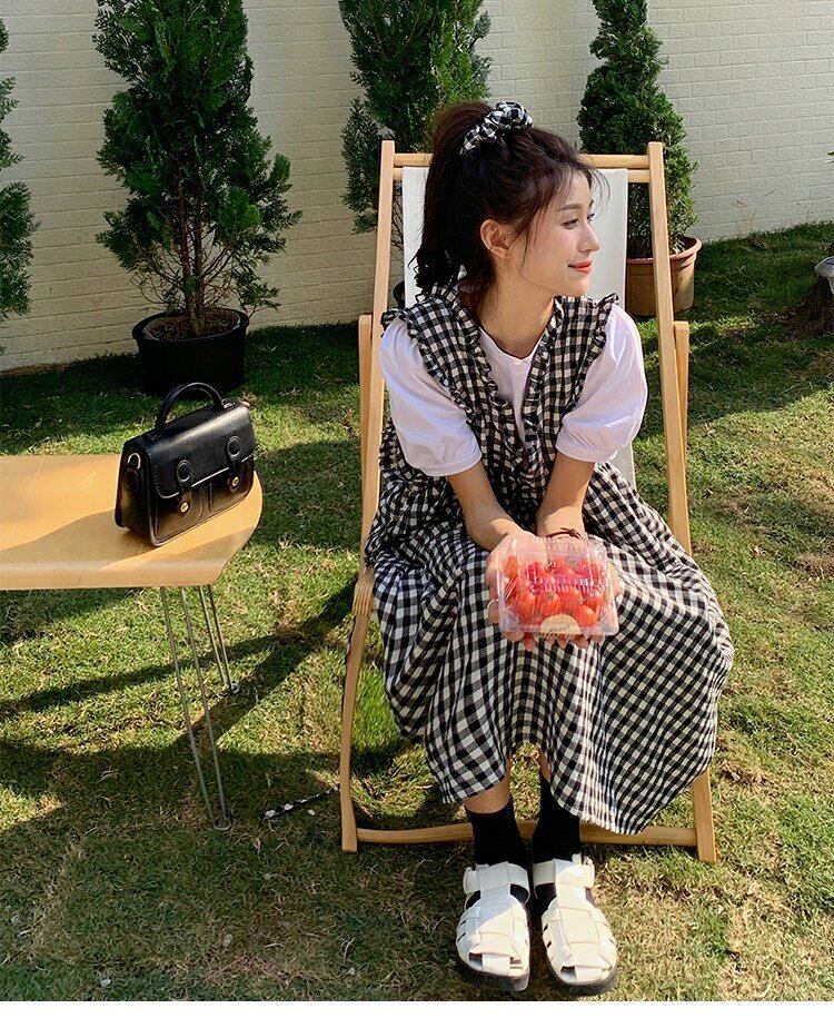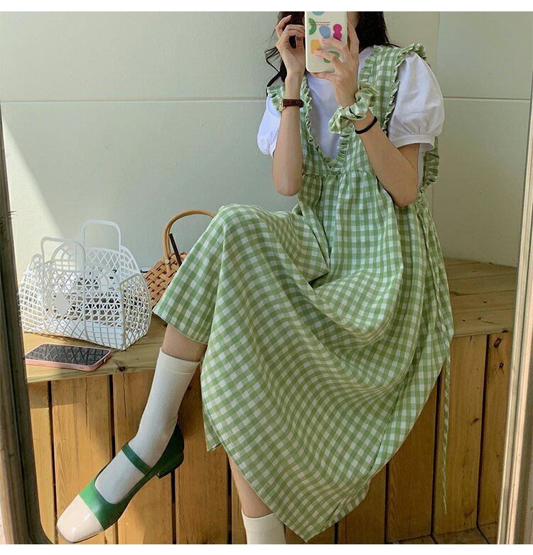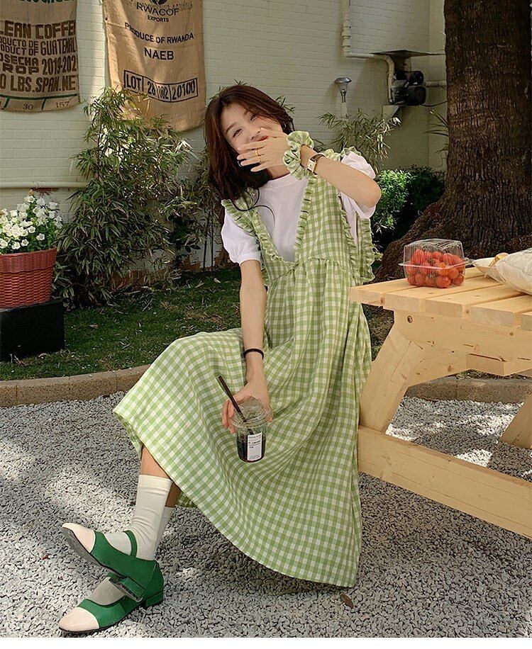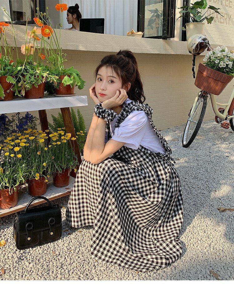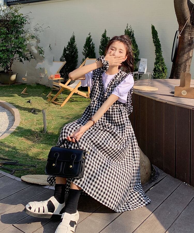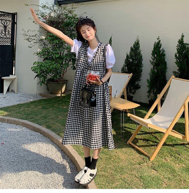 Vネック格子柄ドレス サマースタイルロングスカート 夏物 s576158547326871