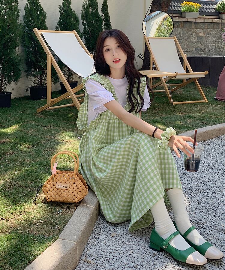 色:グリーンスカート,ブラック/ホワイトgrid,ホワイトt-shirt