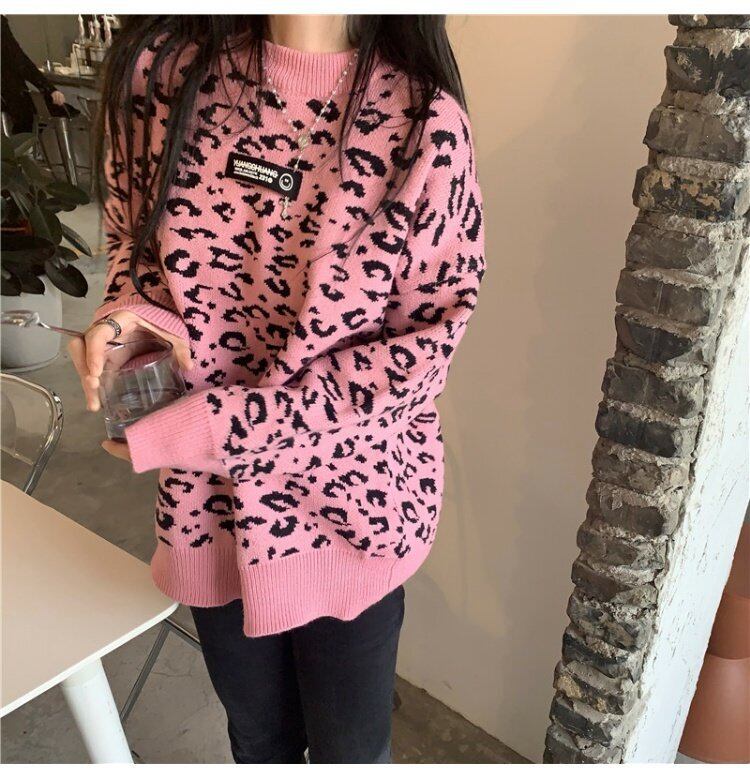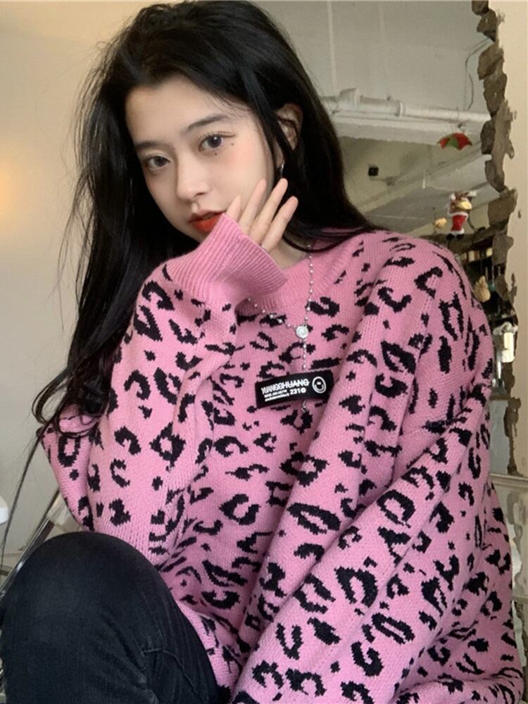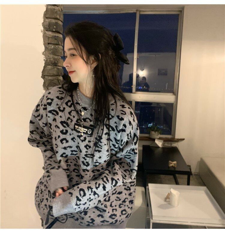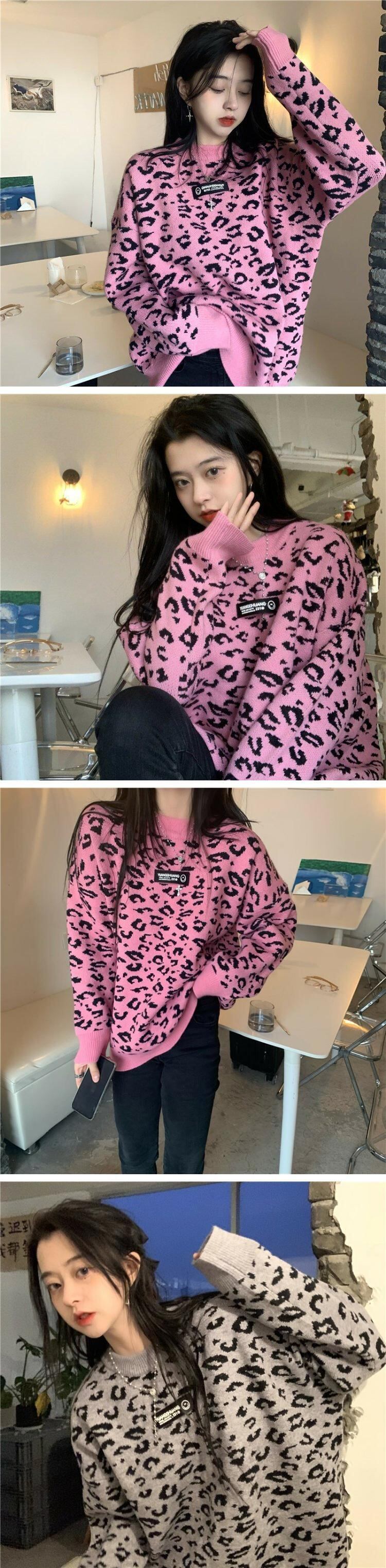 レオパードプリント柄セーター オータムウィンタースタンダードルーズスタイルニットトップス レトロ 秋物 冬物 s576196955319078