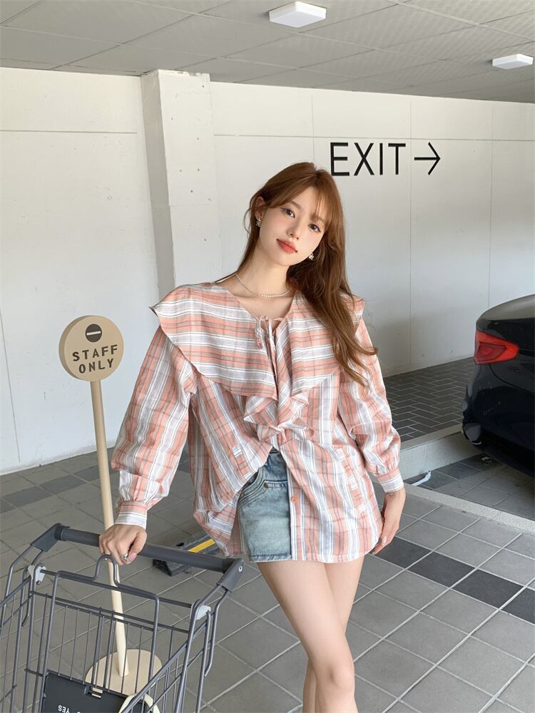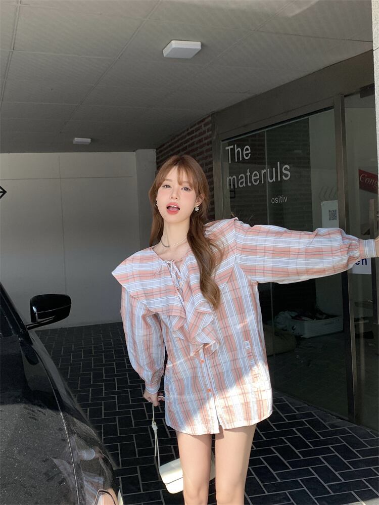 カラー格子柄シャツ オータムトップス ロング 大人ガーリー スウィート キュート カジュアル 秋物 s576192308073620