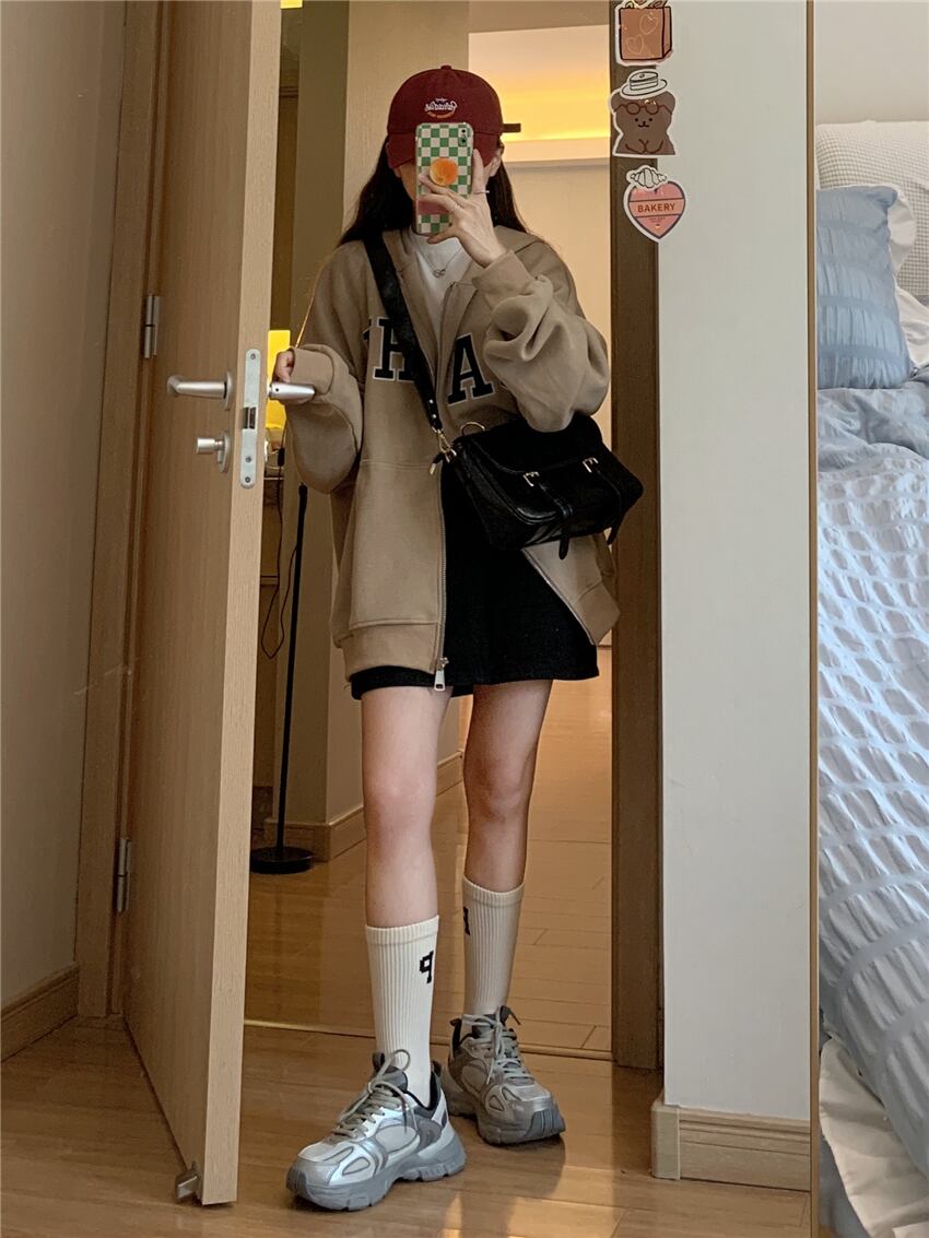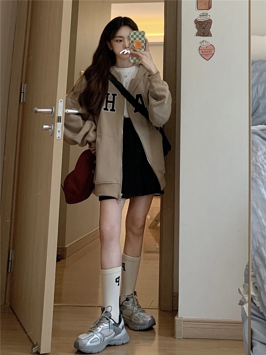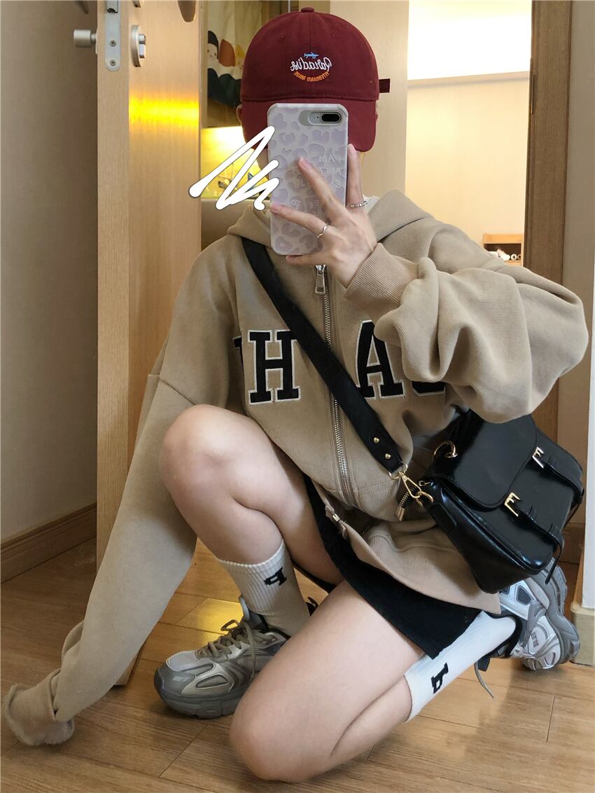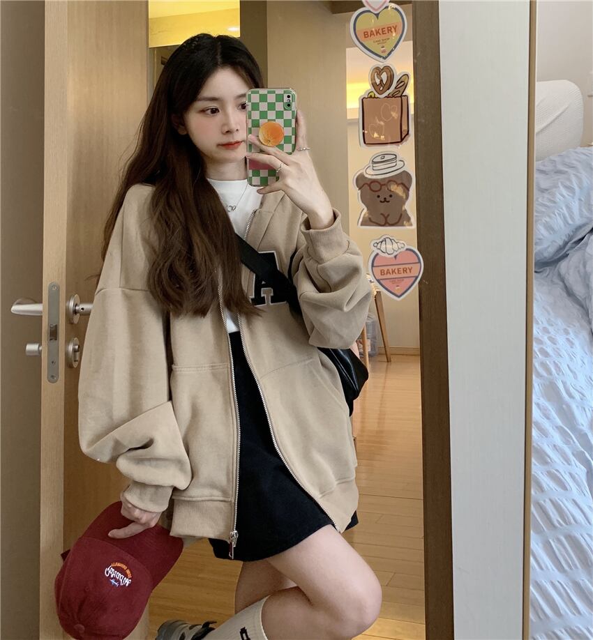 カーキジッパーセーター ジャケット オータムルーズスタイルフードトップス ロング 秋物 s576131797901784