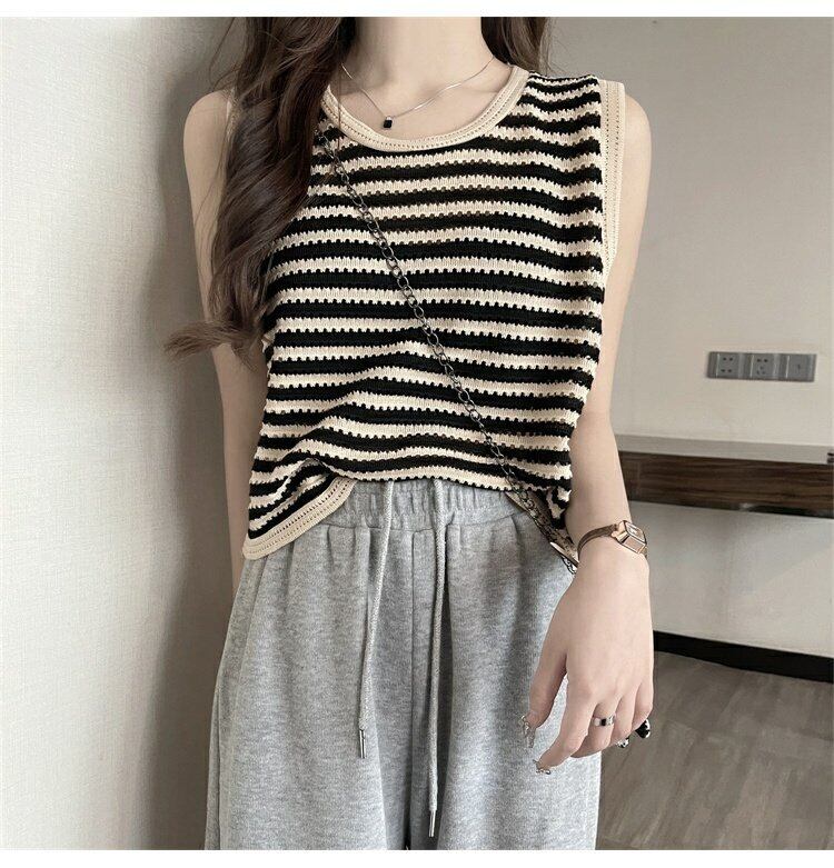 ブラックホワイトストライプニットサマートップス レッドノースリーブショート 夏物 s576132232758988