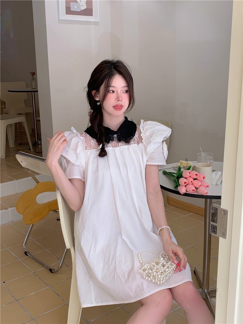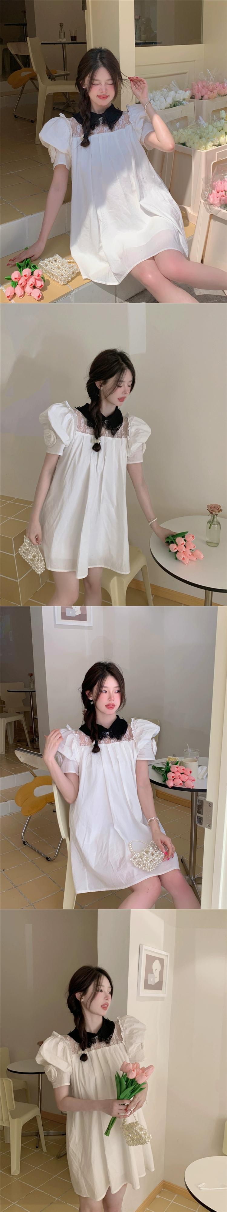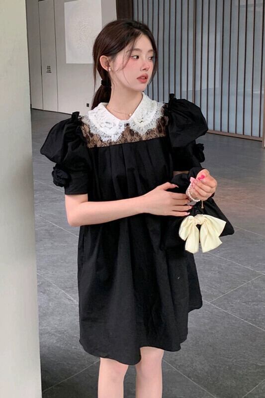パフスリーブレースドレスレディース2023夏新作フレンチスタイルのハイエンドの気質優しく甘い黒のスカート ブラック 大人ガーリー スウィート キュート カジュアル サマー 夏物 8571675781529097