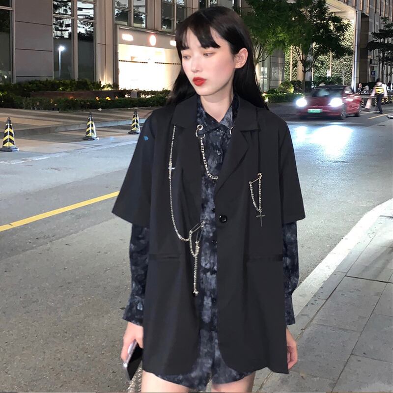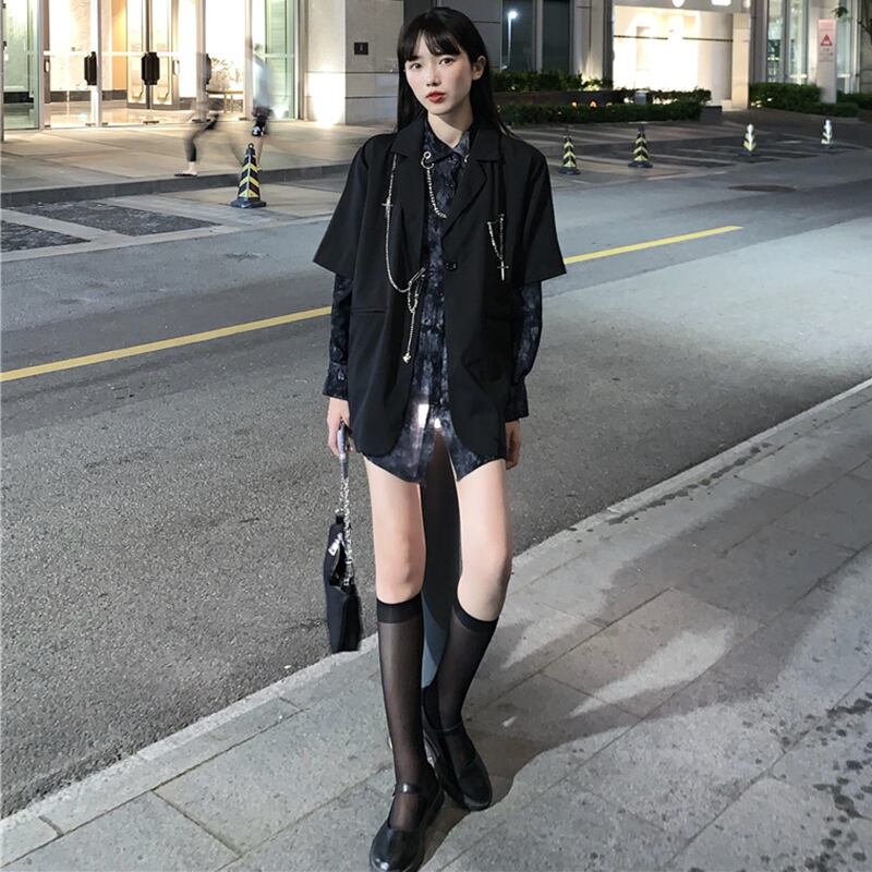 ダークスーツ婦人服春秋2023黒スーツジャケット+プリントシャツネットレッドツーピースイントレンド ブラック スプリング 春物 オータム 秋物 8571630405339638