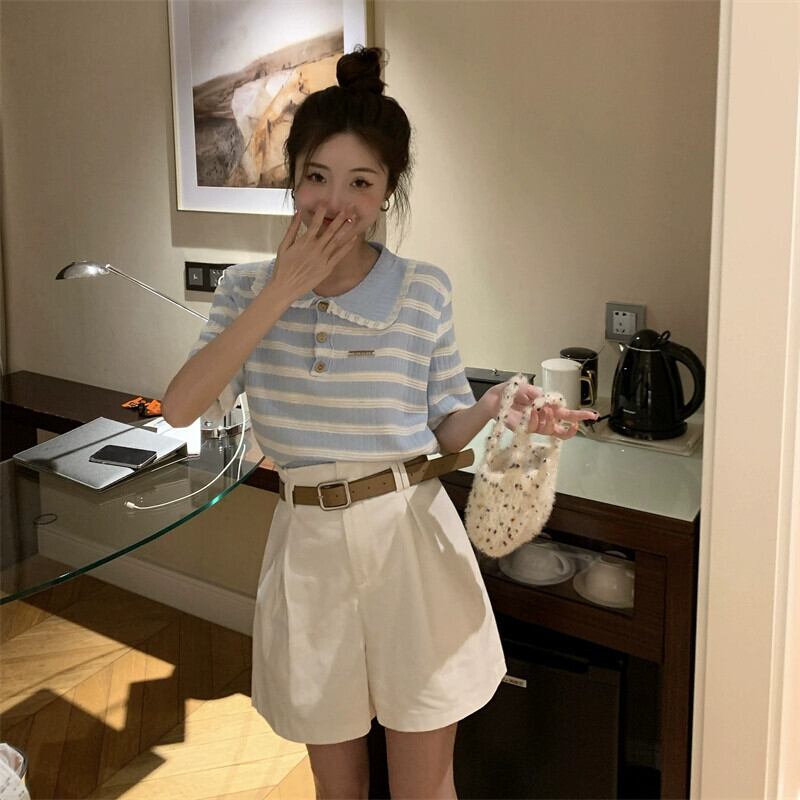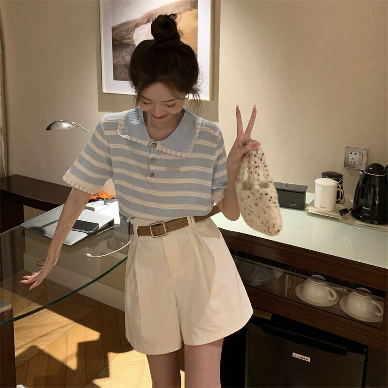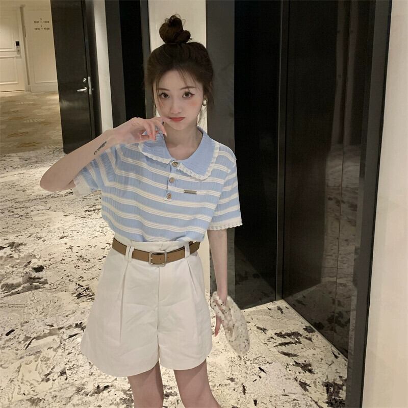 ポロカラーストライプ半袖セーターレディース2023年夏新デザインセンスニッチ優しい甘いトップス 大人ガーリー スウィート キュート カジュアル サマー 夏物 857165847372466