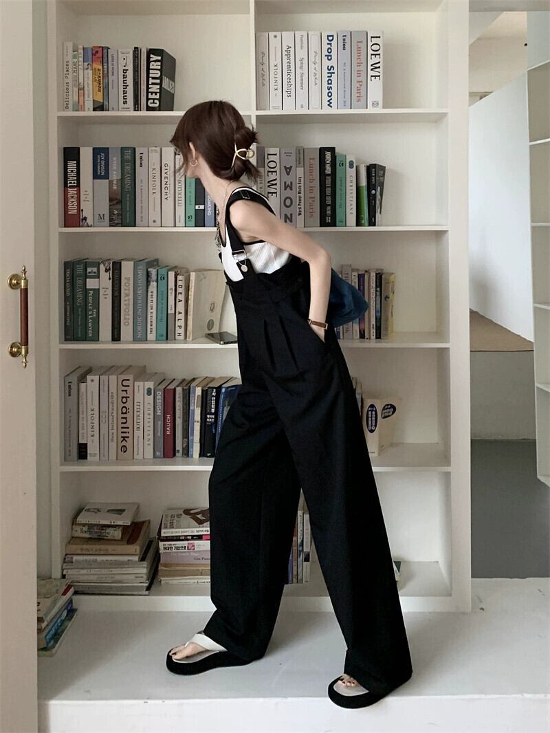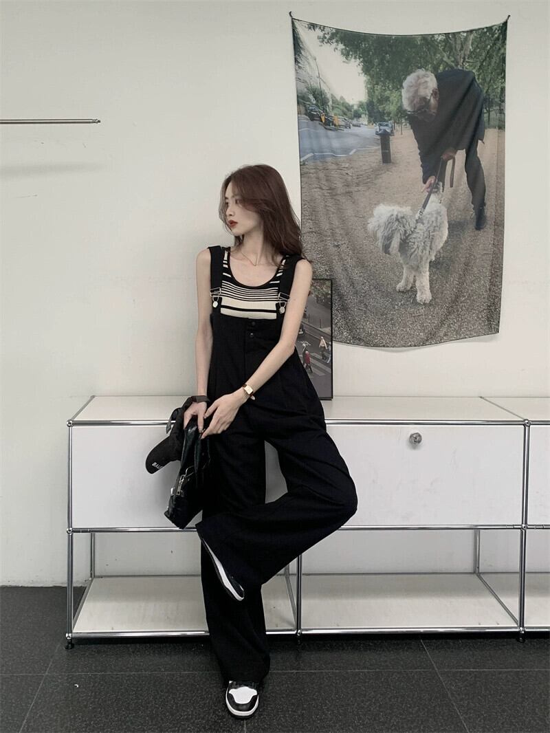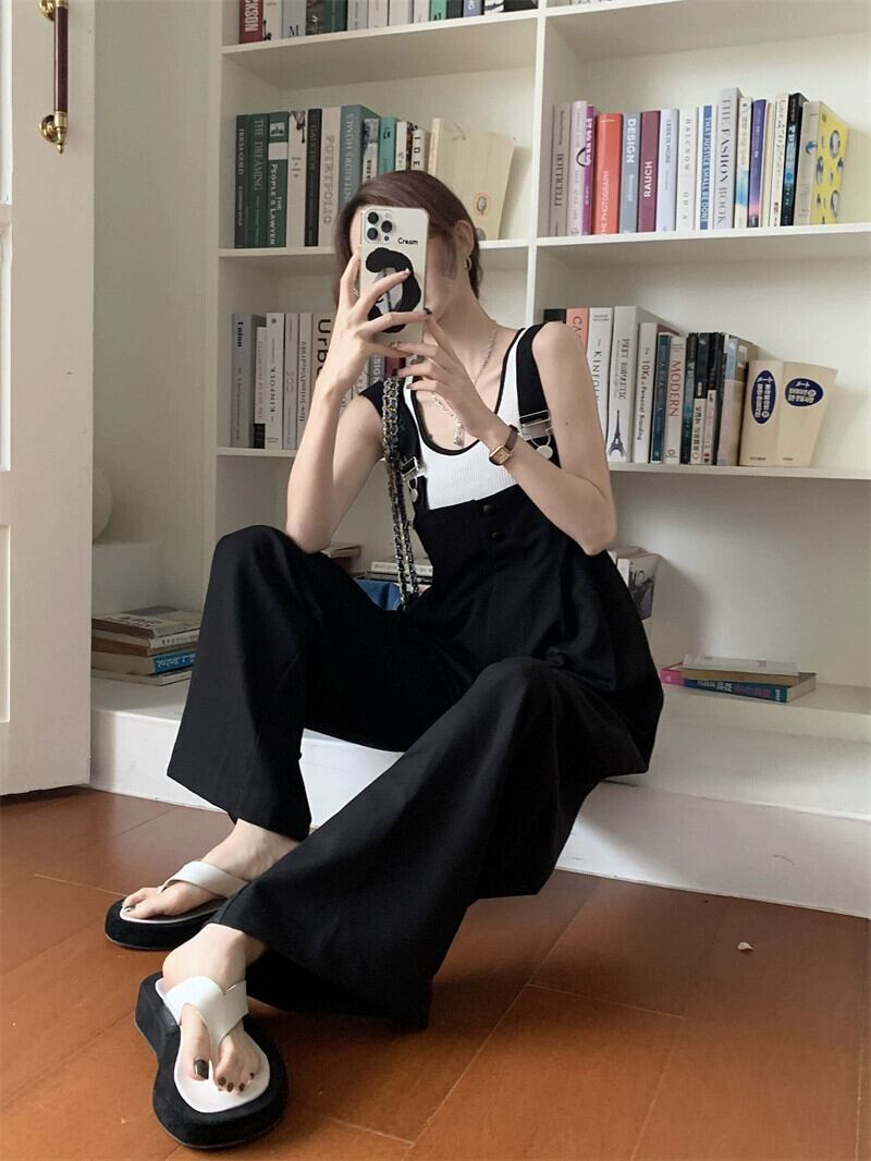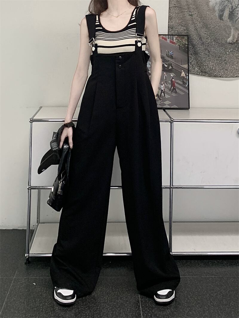 黒サスペンダー女性の夏薄部 2023 新しいデザインセンス小さなルーズストレートチューブフロアモップワイドレッグパンツ ブラック サマー 夏物 ワイドパンツ 8571672434005267