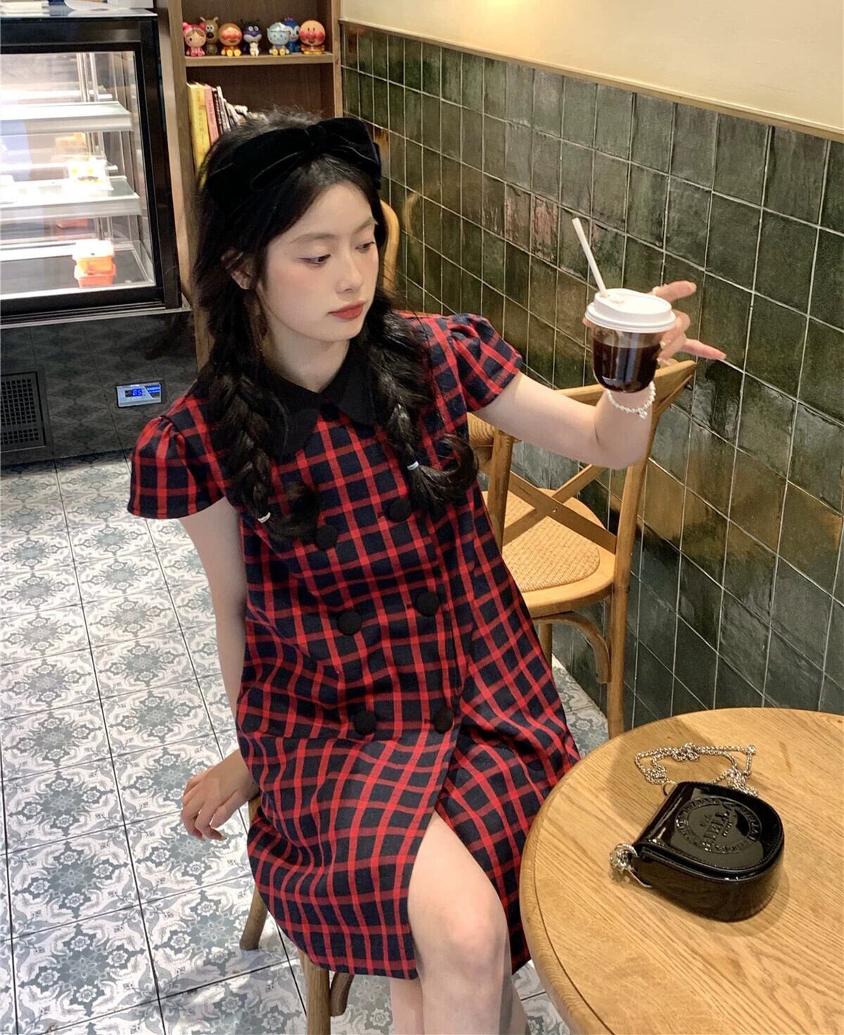Xiaoxiang コントラストカラーの花びら襟チェック柄ドレス夏 2023 気質ウエストガーリーショートスカート サマー 夏物 8571624261181792