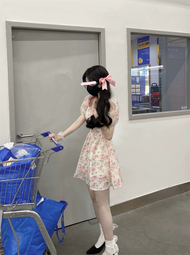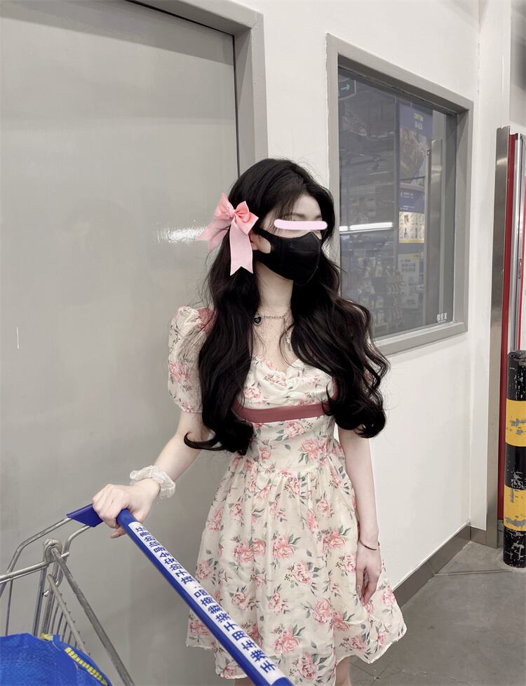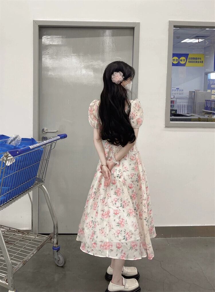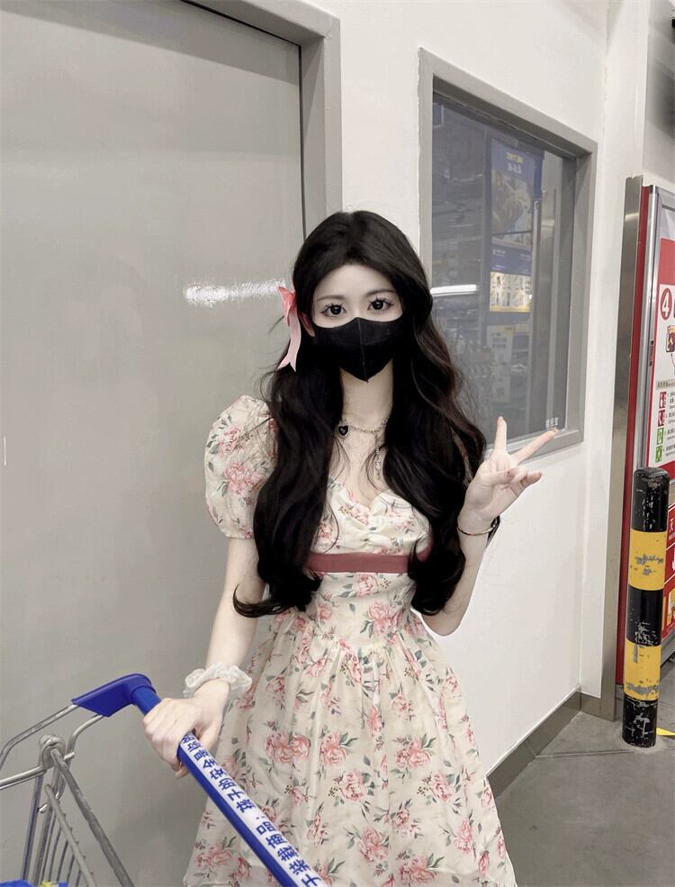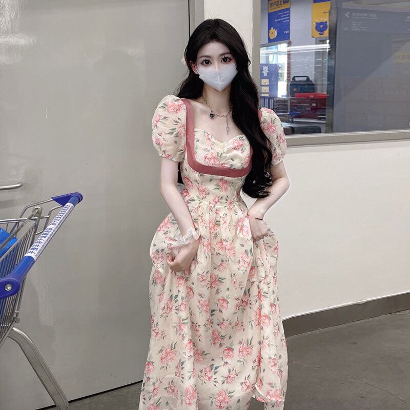 花柄ドレス女性デザインセンスニッチ夏フレンチスタイル優しい風美しいパフスリーブウエストロングスカート サマー 夏物 8571632048742447