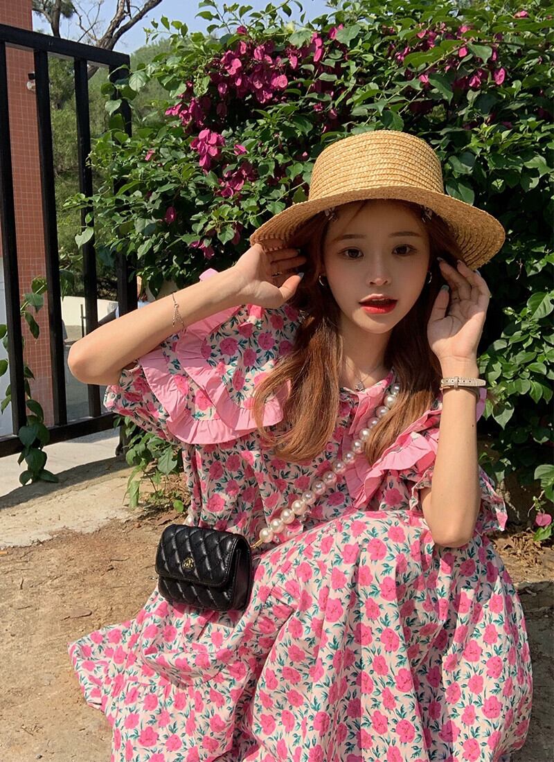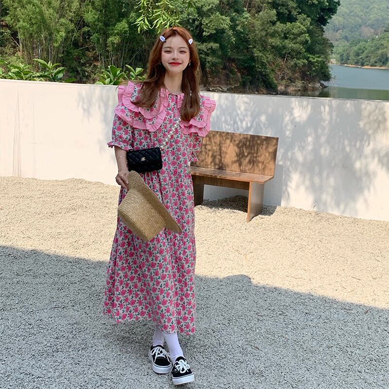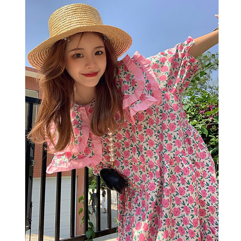 ドールカラー花柄ドレス女性の 2023 夏の新デザインセンスニッチ気質ミルク甘い年齢軽減ロングスカート 大人ガーリー スウィート キュート カジュアル サマー 夏物 857165533145953
