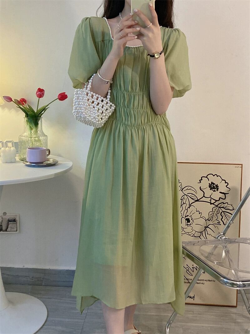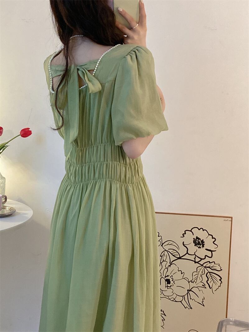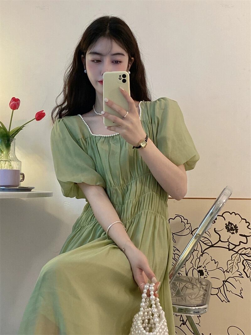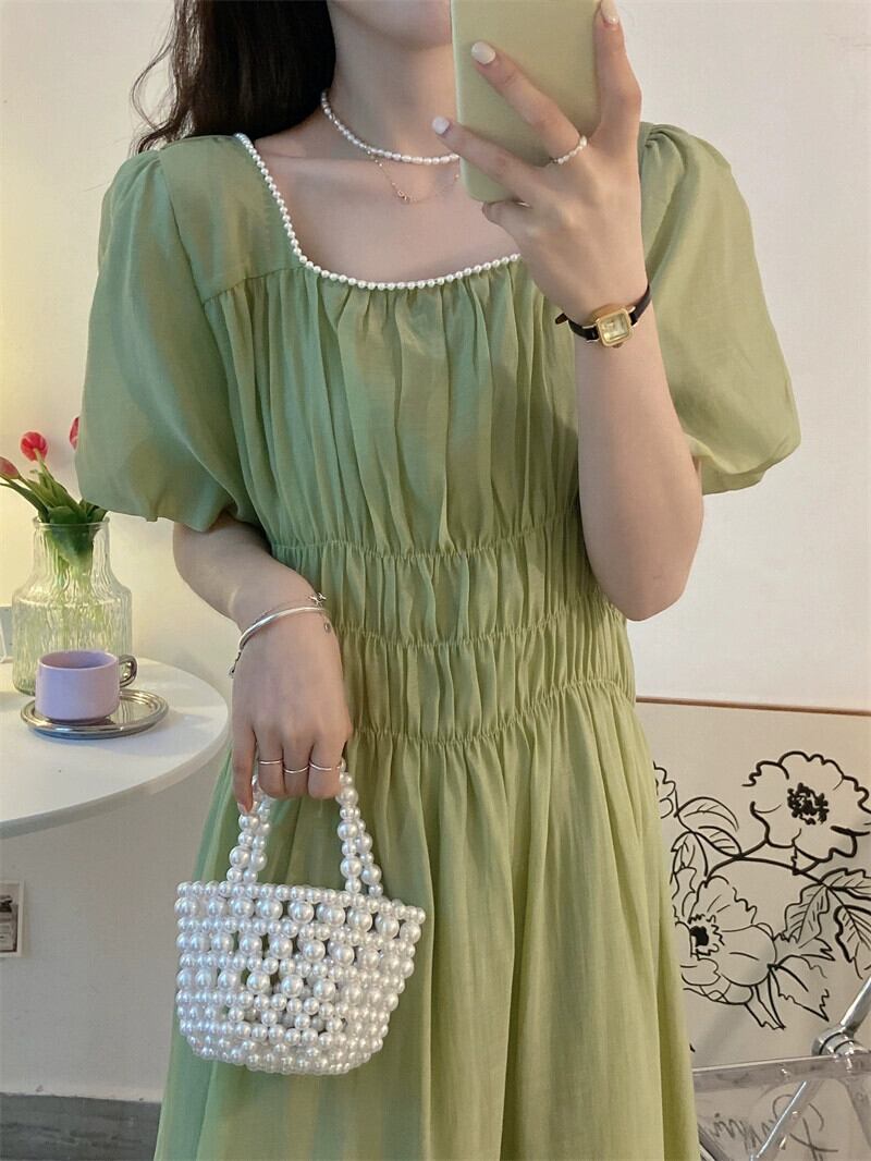 コールドスタイルの高級感ドレス美しい小さなスカートの女性の 2023 夏の新しいパールスクエアカラーウエスト A ラインスカート サマー 夏物 Aライン 真珠 スクウェア 8571629731417627