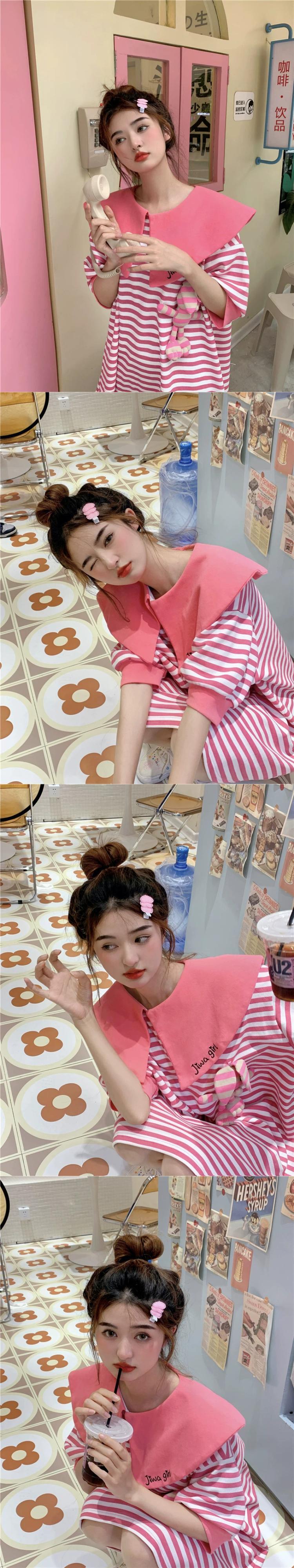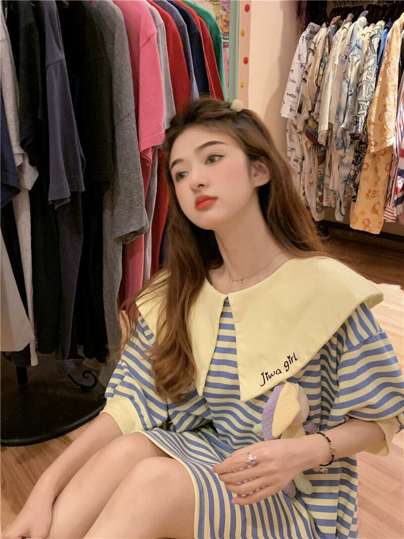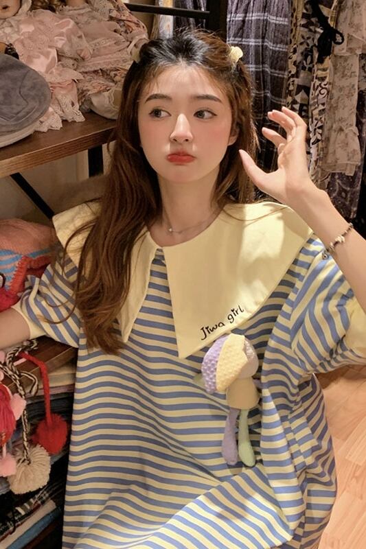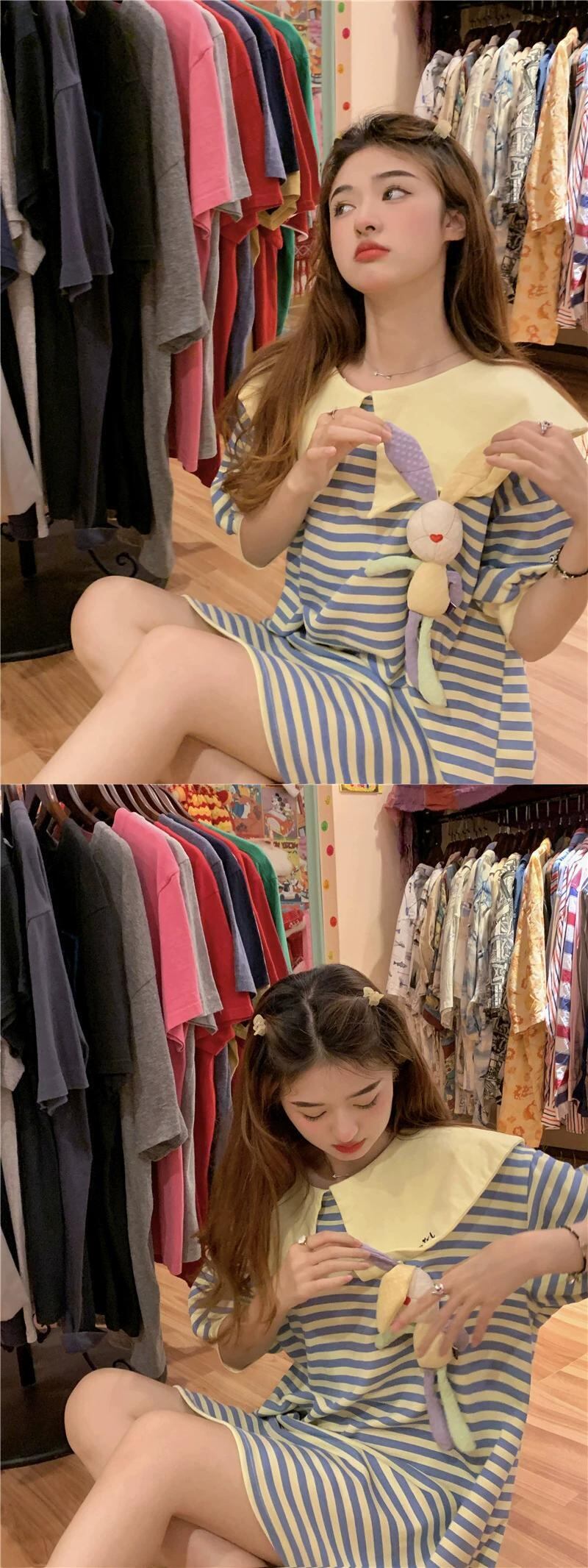 ストライプ T シャツドレス女性の夏 2023 新しい小さな立体バニー甘い初恋人形の襟スカート 大人ガーリー スウィート キュート カジュアル サマー 夏物 Tシャツ 8571689577561707