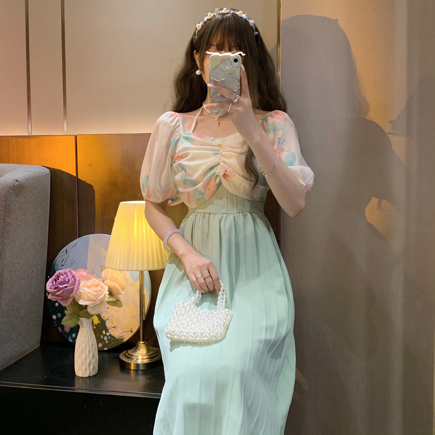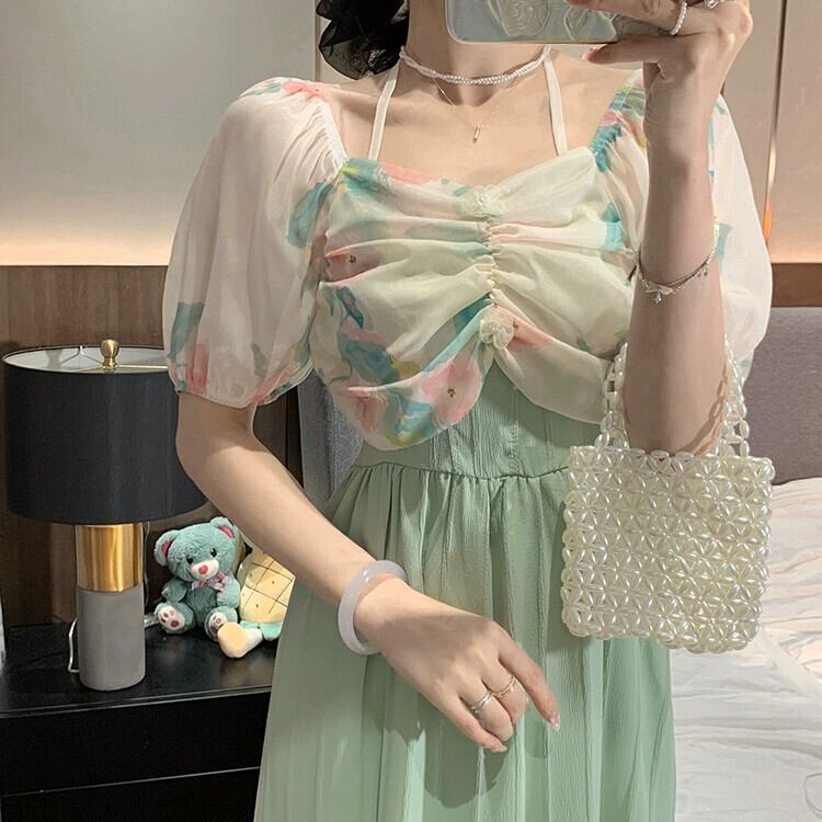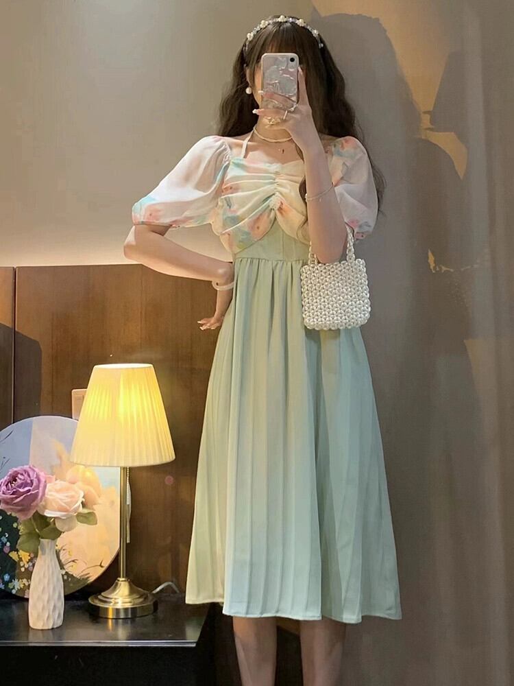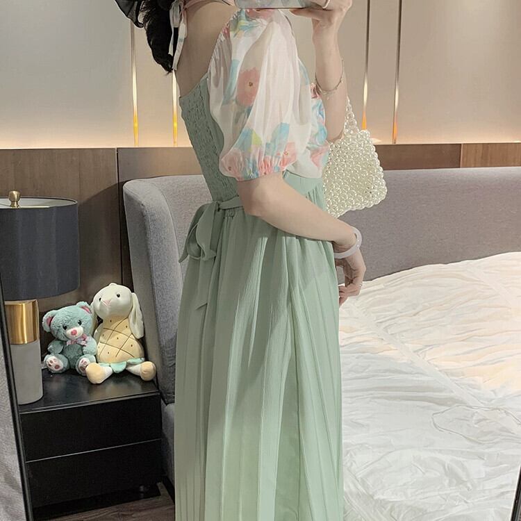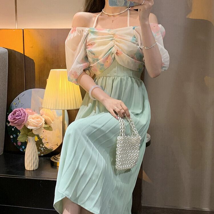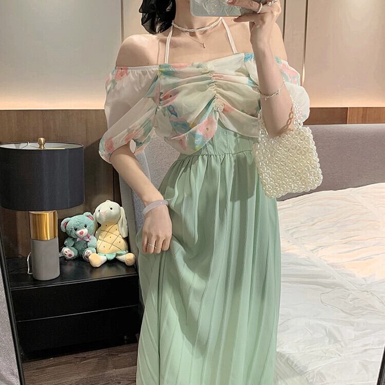 ワンショルダーホルターネックドレスレディース2023年夏新デザイン気質女神ファンパフスリーブロングスカート サマー 夏物 8571672751074883