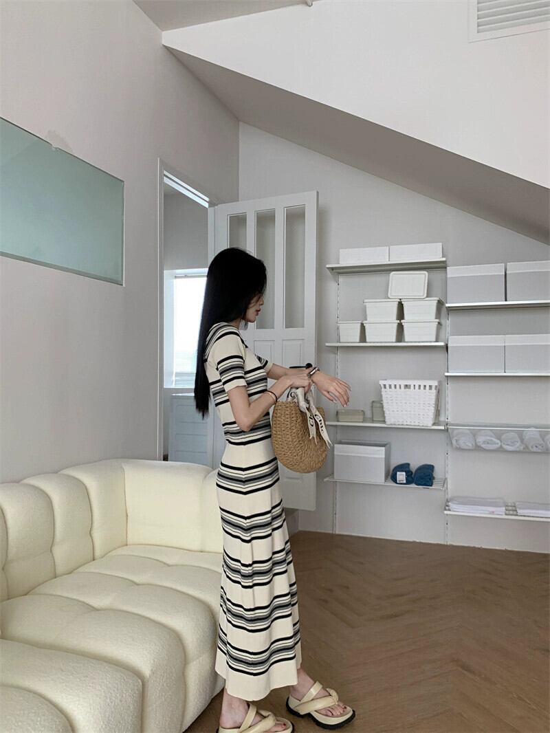 小さなスクエアカラー半袖ストライプスリムドレス女性の 2023 夏の新バージョンの小さなロングスカート サマー 夏物 スクウェア 8571668913337992