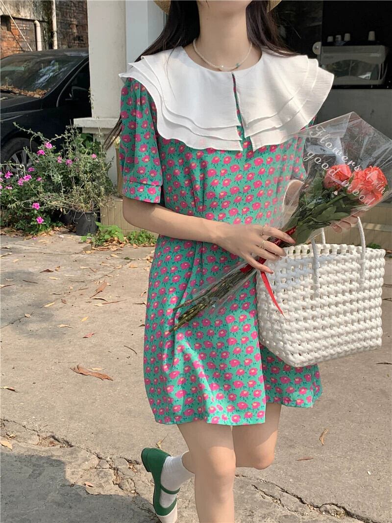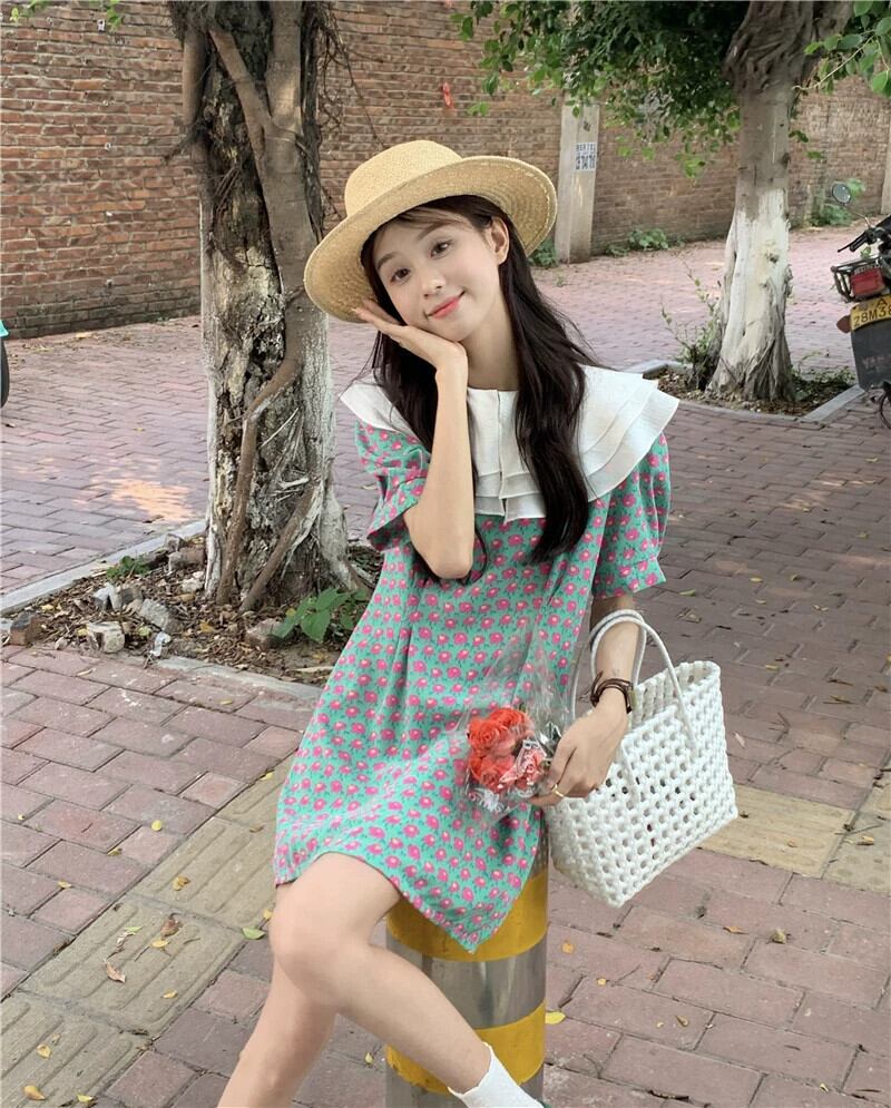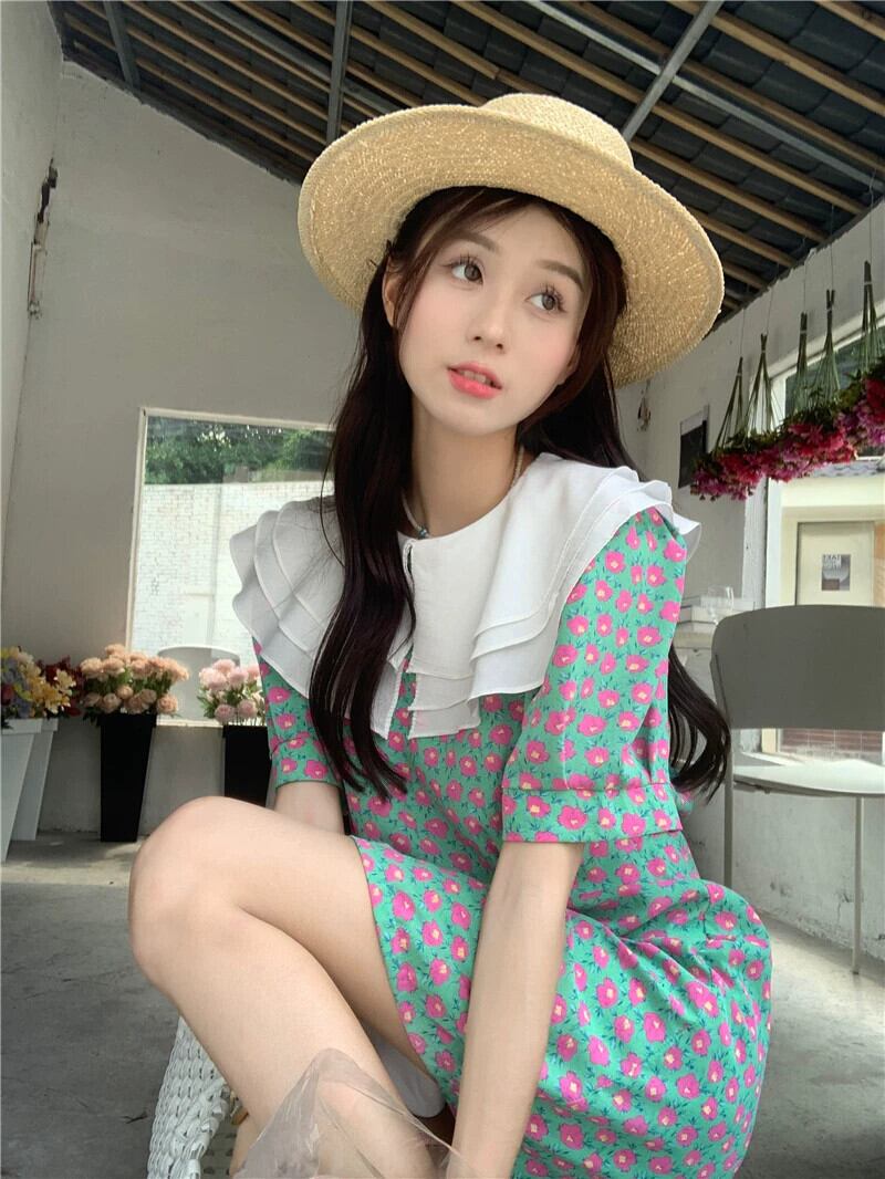 ドールカラー花柄ドレスレディースデザインセンスニッチサマーミルク甘くて優しい初恋小さなショートスカート 大人ガーリー スウィート キュート カジュアル 夏物 8571620835865168
