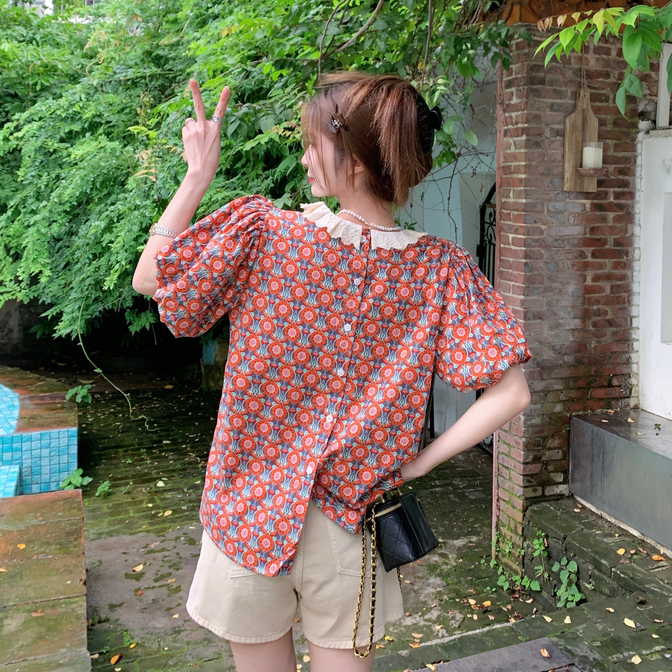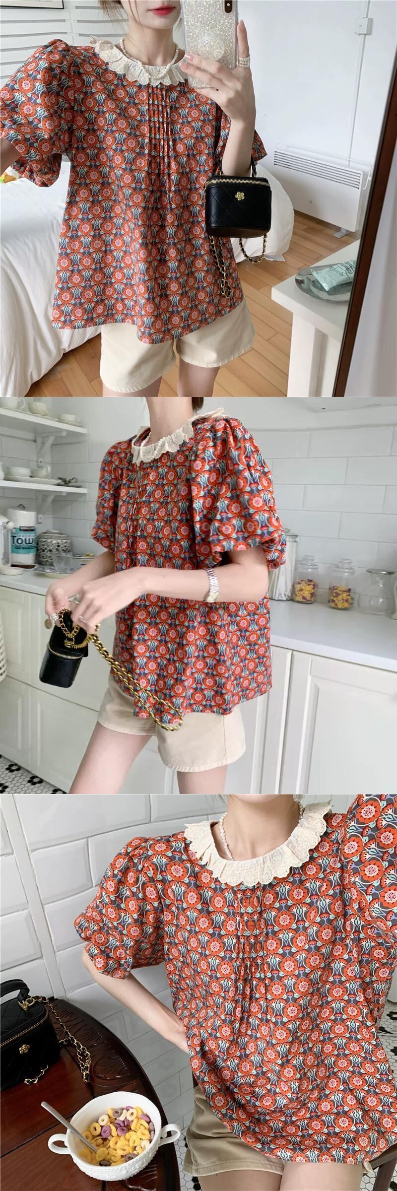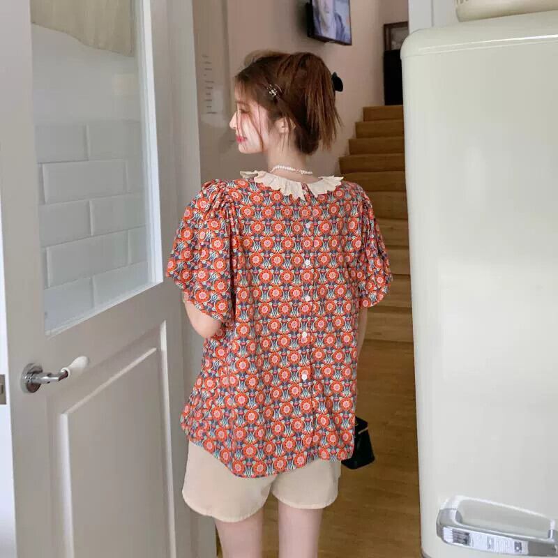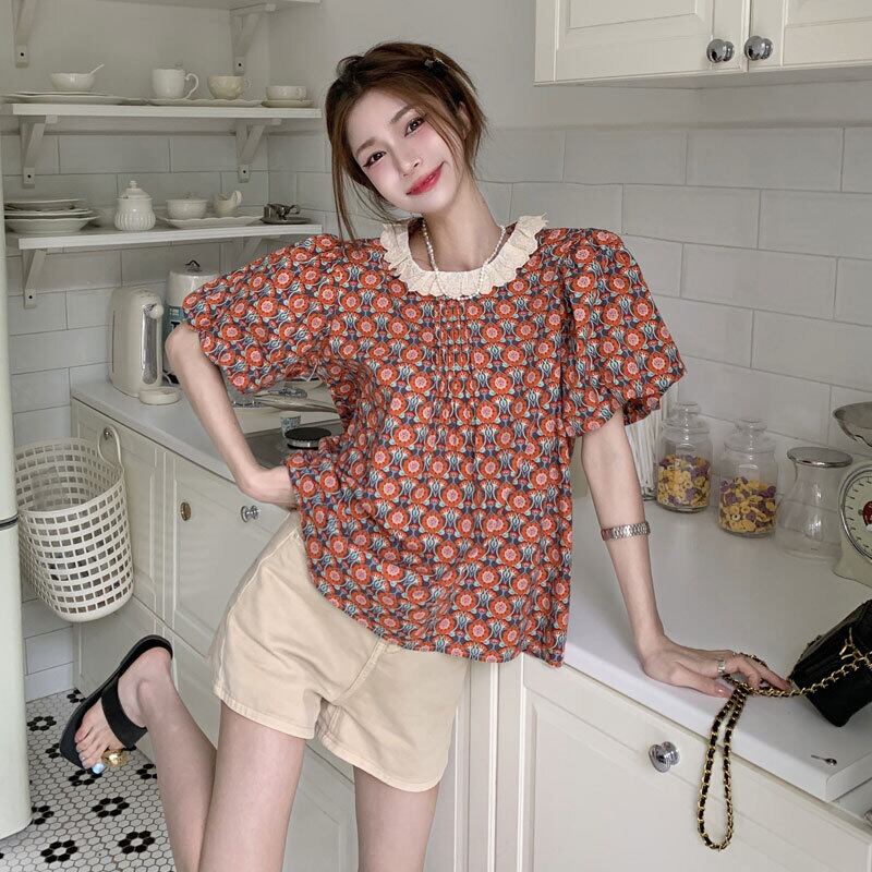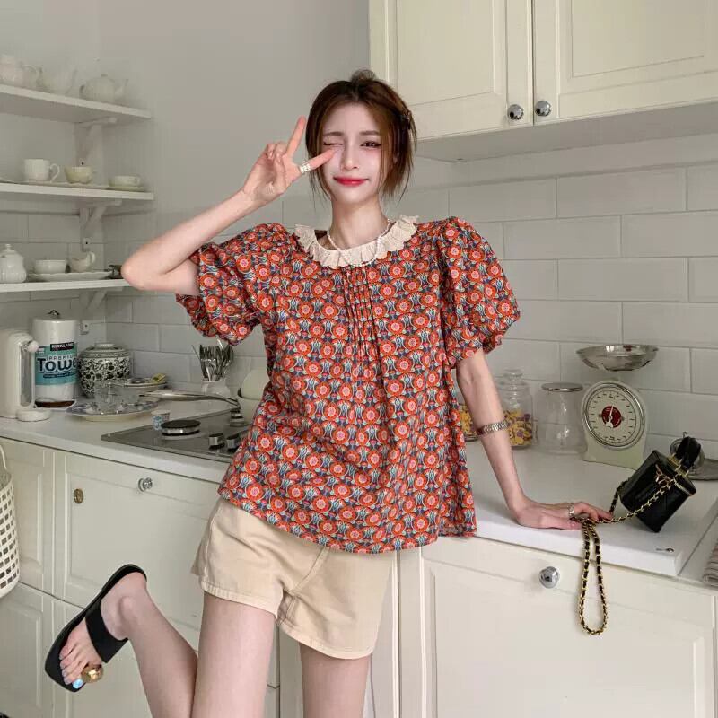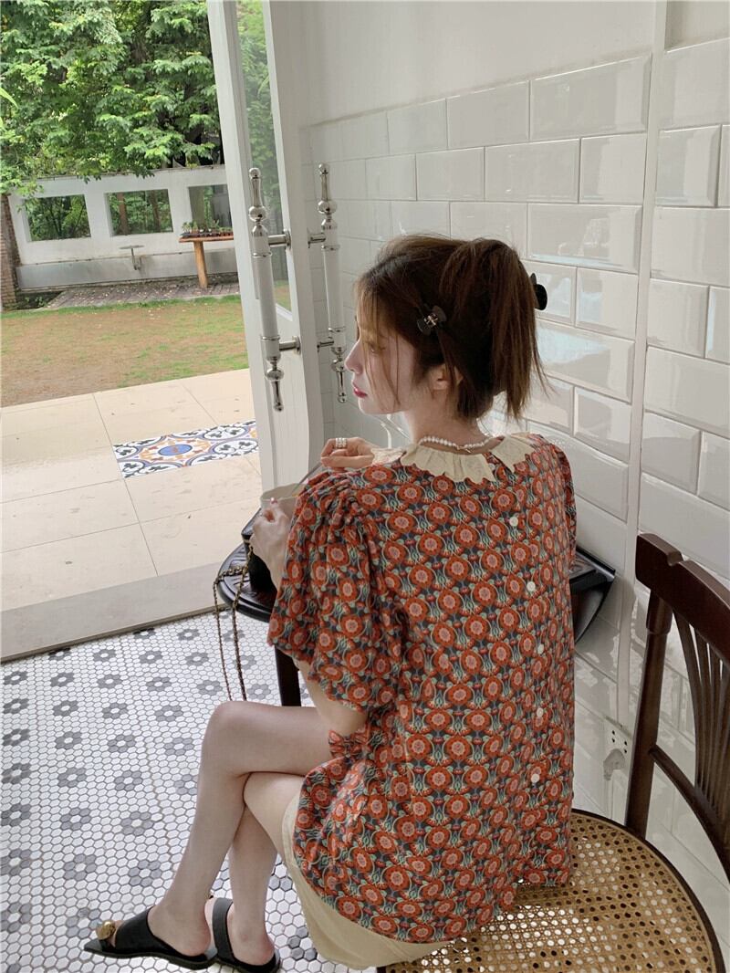 フレンチレトロパフスリーブトップ女性の夏のデザインセンスニッチシックシャツ2023新しい半袖花柄シャツ サマー 夏物 8571675182598890