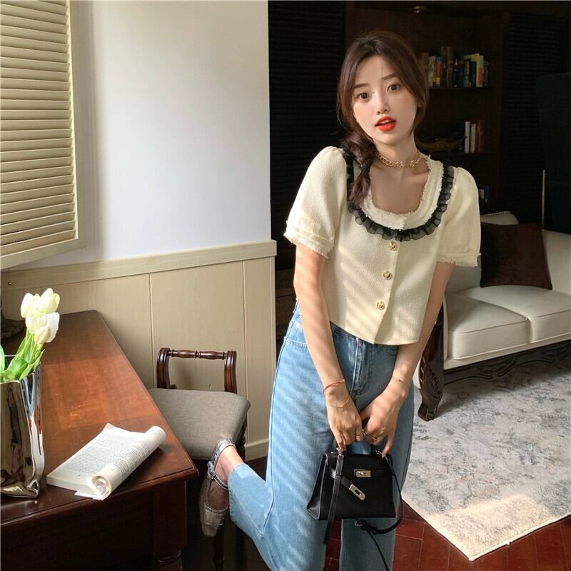 フランスの小さな香りのよいスクエアカラーショートトップ女性の2023年夏新デザインセンスニッチ気質甘い半袖Tシャツ 大人ガーリー スウィート キュート カジュアル サマー 夏物 スクウェア 8571654854180383